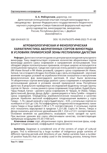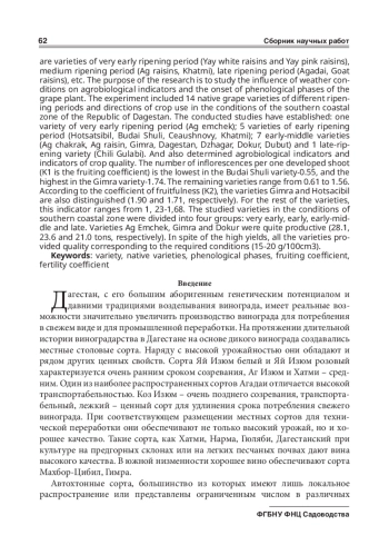 Дагестан считается одним из центров происхождения культурного винограда. Тому свидетельствует огромное количество аборигенных сортов винограда разного срока созревания и направления использования. Они обладают рядом положительных признаков, которые широко используются в селекционном процессе. Среди них сорта как очень раннего срока созревания (Яй Изюм белый и Яй Изюм розовый), среднего срока созревания (Аг Изюм, Хатми), так и позднего (Агадаи, Коз Изюм и др.). Цель исследований – изучение влияния погодных условий на агробиологические показатели и наступление фенологических фаз виноградного растения. В опыт были включены 14