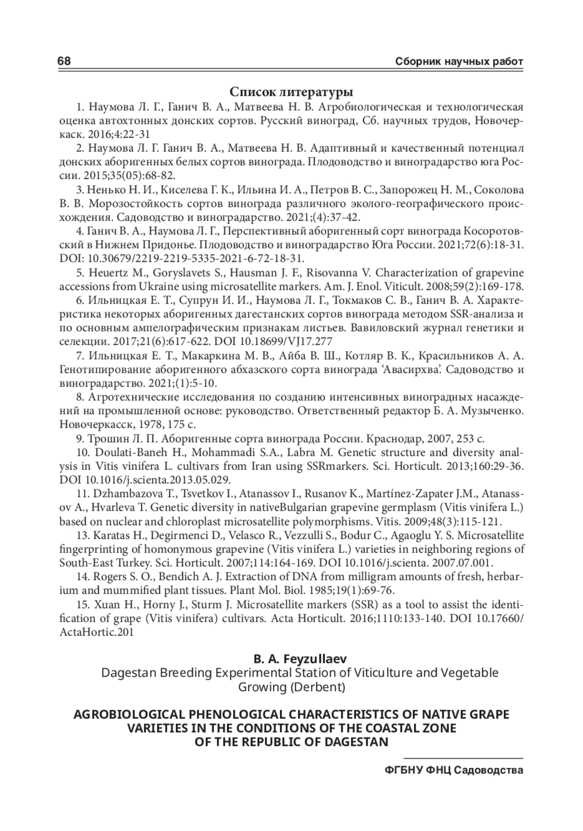 2. Наумова Л. Г. Ганич В. А., Матвеева Н. В. Адаптивный и качественный потенциал донских аборигенных белых сортов винограда. Плодоводство и виноградарство юга России. 2015;35(05):68-82.