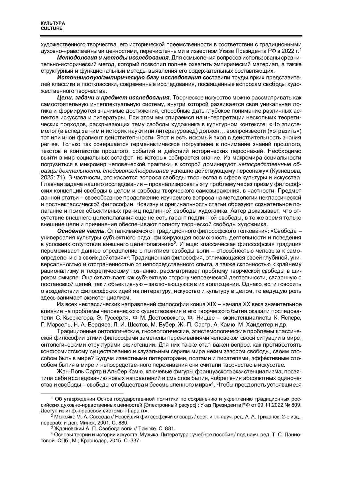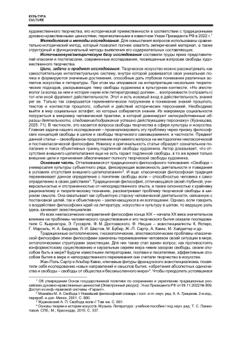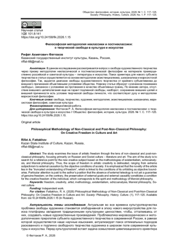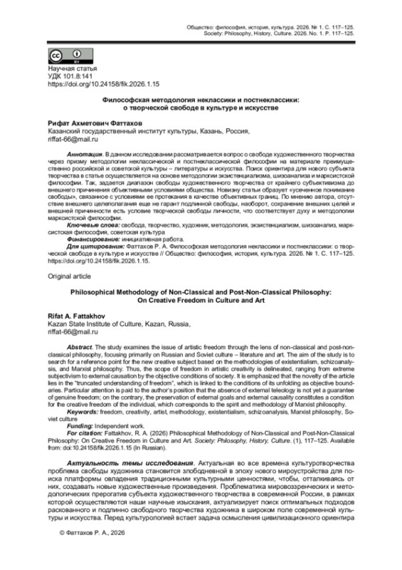 В данном исследовании рассматривается вопрос о свободе художественного творчества через призму методологии неклассической и постнеклассической философии на материале преимущественно российской и советской культуры - литературы и искусства. Поиск ориентира для нового субъекта творчества в статье осуществляется на основе методологии экзистенциализма, шизоанализа и марксистской философии. Так, задается диапазон свободы художественного творчества от крайнего субъективизма до внешнего причинения объективными условиями общества. Новизну статьи образует «усеченное понимание свободы», связанное с условиями ее протекания в качестве объективных границ. По мнению автора, отсутствие внешнего целеполагания еще не гарант подлинной свободы, наоборот, сохранение внешних целей и внешней причинности есть условие творческой свободы личности, что соответствует духу и методологии марксистской философии.