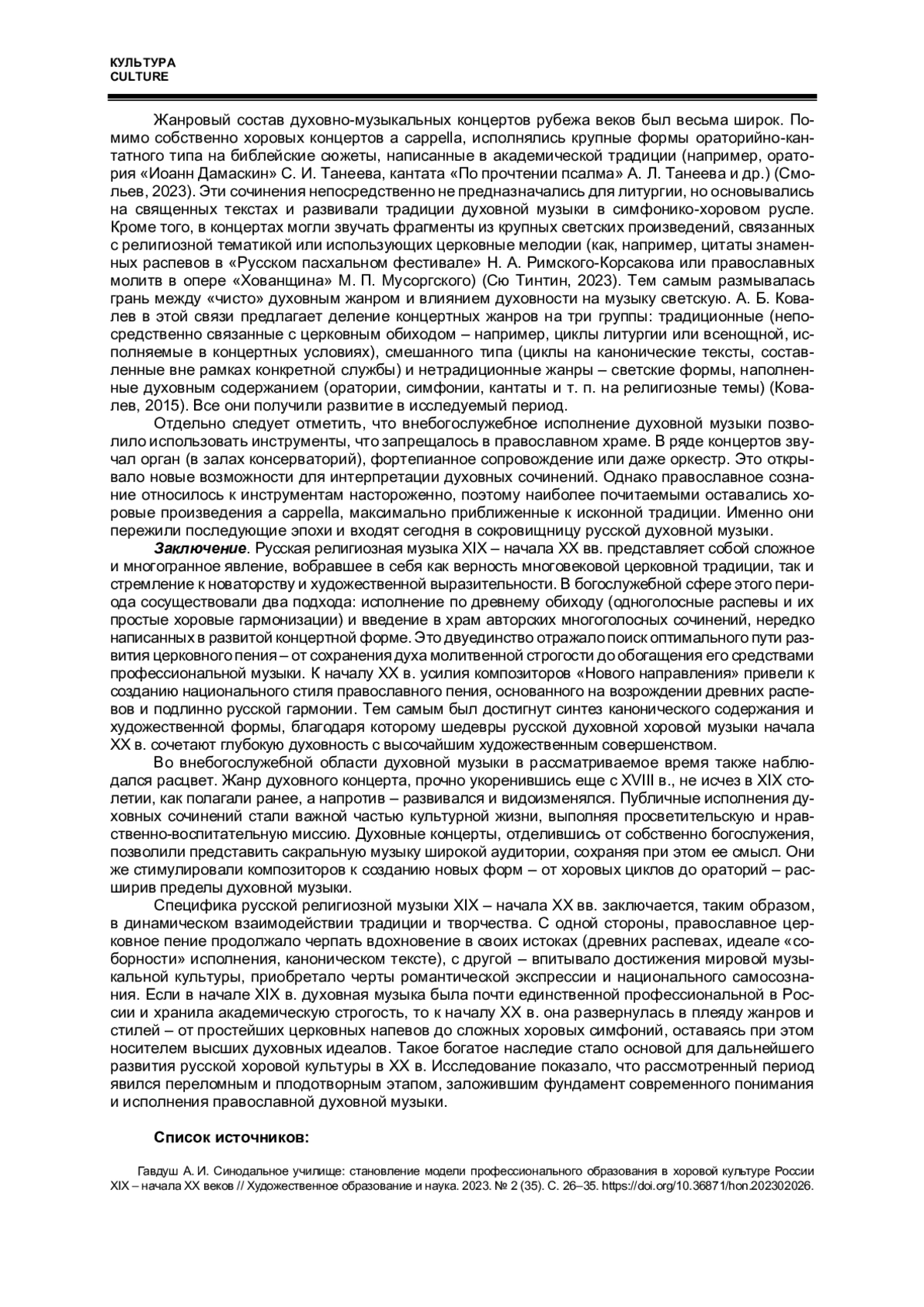 1. Гавдуш А. И. Синодальное училище: становление модели профессионального образования в хоровой культуре России XIX - начала XX веков // Художественное образование и наука. 2023. № 2 (35). С. 26-35. DOI: 10.36871/hon.202302026 EDN: LMRXFO