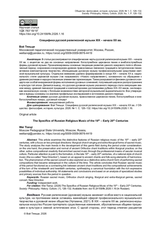 В статье рассматриваются специфические черты русской религиозной музыки XIX - начала XX вв. с акцентом на два ее основных направления: богослужебное церковное пение и внебогослужебные формы духовной музыки. Проанализированы основные тенденции развития данного жанрового поля в обозначенный период: сохранение и возрождение древних православных певческих традиций в литургическом пении; активное композиторское творчество, обогащающее духовную музыку профессиональными средствами светской музыкальной культуры. Отдельное внимание уделено формированию в конце XIX - начале XX в. национального стиля церковной музыки (так называемого «Нового направления»), основанного на обращении к древним распевам и народно-песенным элементам гармонизации. Также раскрывается феномен духовного концерта как особой внехрамовой формы исполнения духовных сочинений, получившей широкое распространение в культуре той эпохи.