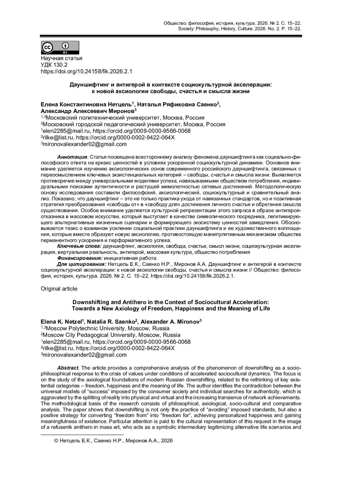 Статья посвящена всестороннему анализу феномена дауншифтинга как социально-философского ответа на кризис ценностей в условиях ускоренной социокультурной динамики. Основное внимание уделяется изучению аксиологических основ современного российского дауншифтинга, связанных с переосмыслением ключевых экзистенциальных категорий - свободы, счастья и смысла жизни. Выявляется противоречие между универсальными моделями успеха, навязываемыми обществом потребления, индивидуальными поисками аутентичности и растущей мимолетностью сетевых достижений. Методологическую основу исследования составили философский, аксиологический, социокультурный и сравнительный анализ. Показано, что дауншифтинг - это не только практика ухода от навязанных стандартов, но и позитивная стратегия преобразования «свободы от» в «свободу для» достижения личного счастья и обретения смысла существования. Особое внимание уделяется культурной репрезентации этого запроса в образе антигероя-отказника в массовом искусстве, который выступает в качестве символического посредника, легитимирующего альтернативные жизненные сценарии и формирующего экосистему ценностей замедления. Обосновывается тезис о взаимном усилении социальной практики дауншифтинга и ее художественного воплощения, которые вместе образуют новую аксиологию, противостоящую манипулятивным механизмам общества перманентного ускорения и перформативного успеха.