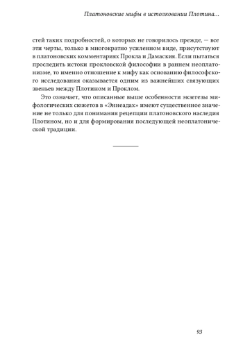 Значительная часть рецепции платонической традиции сосредоточена на интерпретации мифологических сюжетов, присутствующих в диалогах. Среди них находят место как традиционные древнегреческие мифы, так и сюжеты, придуманные самим Платоном. И те, и другие становятся предметом истолкования в «Эннеадах» Плотина, приобретая новое прочтение. Плотин предлагает свой метод истолкования мифологических сюжетов, сводя разнообразие действующих лиц, событий и различных малых подробностей к единой метафизической модели, обладающей простотой, внутренней целостностью и неизменностью. К одним и тем же умопостигаемым началам сводятся различные боги древнегреческой мифологии, тогда как отношения между ними, равно как и второстепенные персонажи, сворачиваются до внутренних связей между онтологическими уровнями в иерархической системе Плотина. Кроме истолкования традиционных античных мифов и мифов, созданных Платоном, Плотин излагает и некоторые собственные построения языком мифа. При этом, однако, его повествование не нуждается в истолковании - так формируется особый тип философско-мифологического нарратива, который приобретет особое значение у более поздних неоплатоников - последователей Плотина. Кроме этого, и другие особенности истолкования мифов в «Эннеадах» выявляют целый ряд как содержательных, так и методологических связей с экзегезой высокого неоплатонизма, в первую очередь Прокла.