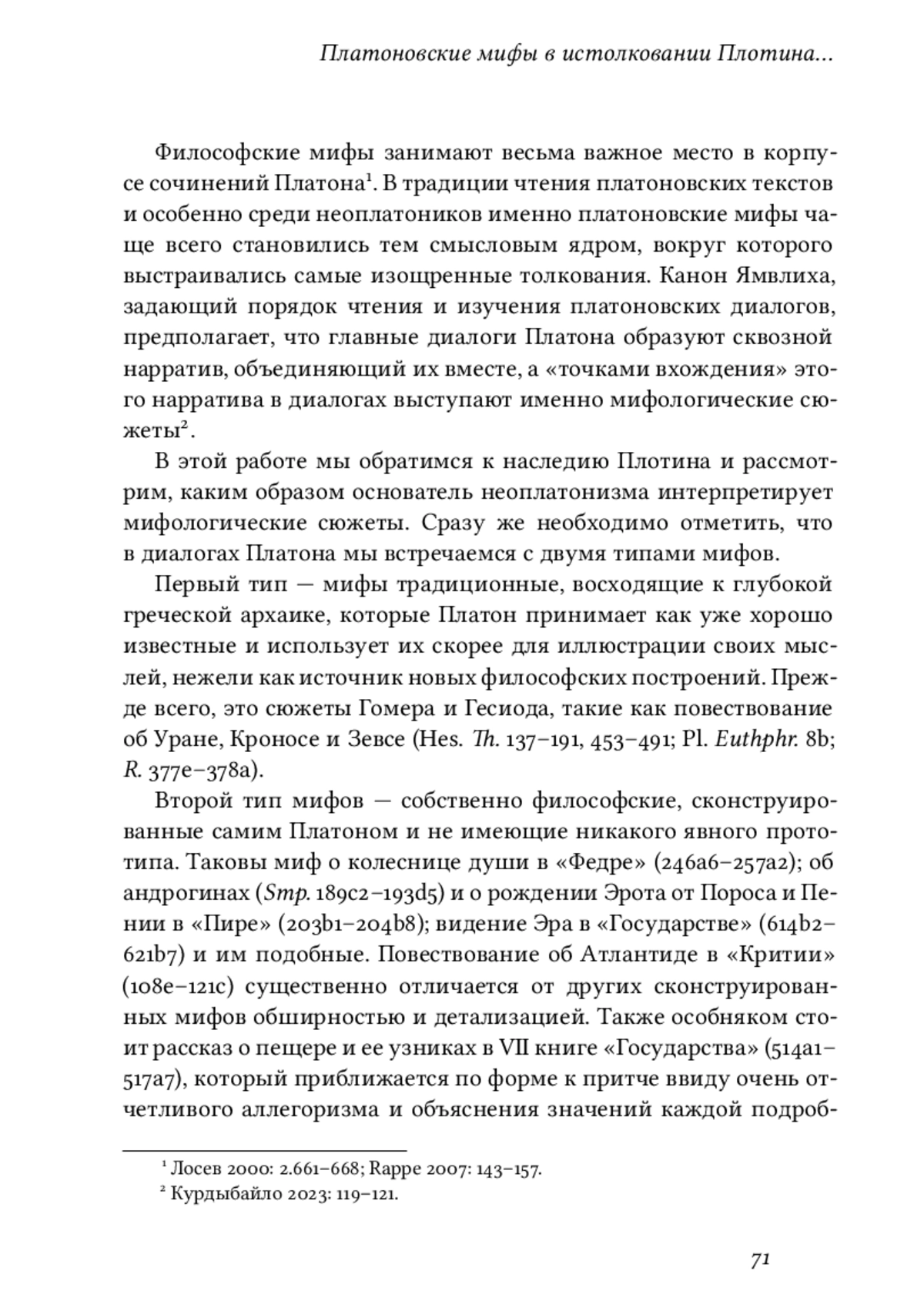 Философские мифы занимают весьма важное место в корпусе сочинений Платона1. В традиции чтения платоновских текстов и особенно среди неоплатоников именно платоновские мифы чаще всего становились тем смысловым ядром, вокруг которого выстраивались самые изощренные толкования. Канон Ямвлиха, задающий порядок чтения и изучения платоновских диалогов, предполагает, что главные диалоги Платона образуют сквозной нарратив, объединяющий их вместе, а «точками вхождения» этого нарратива в диалогах выступают именно мифологические сюжеты2.