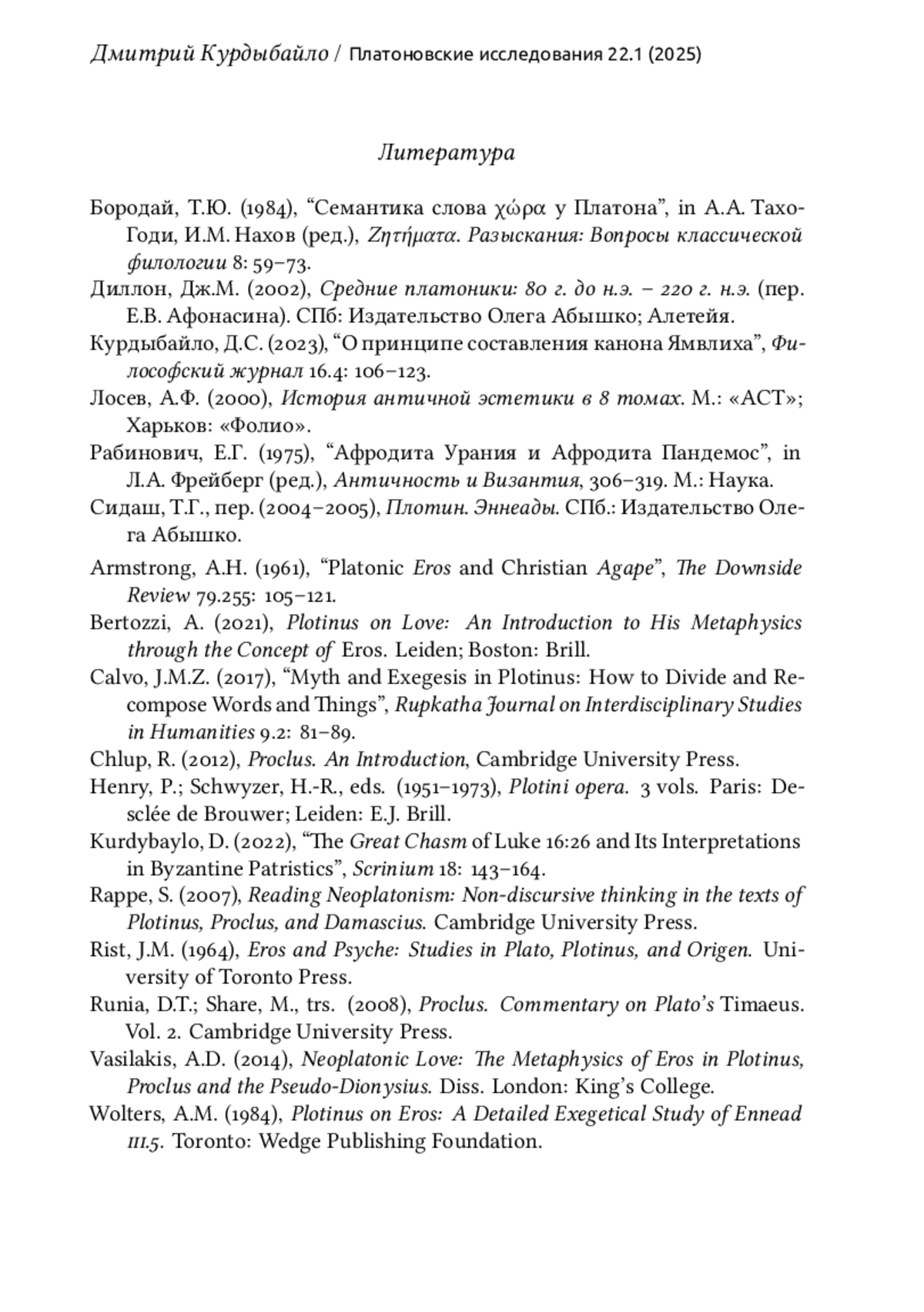 3. Курдыбайло, Д.С. (2023), “О принципе составления канона Ямвлиха”, Философский журнал 16.4: 106-123.
