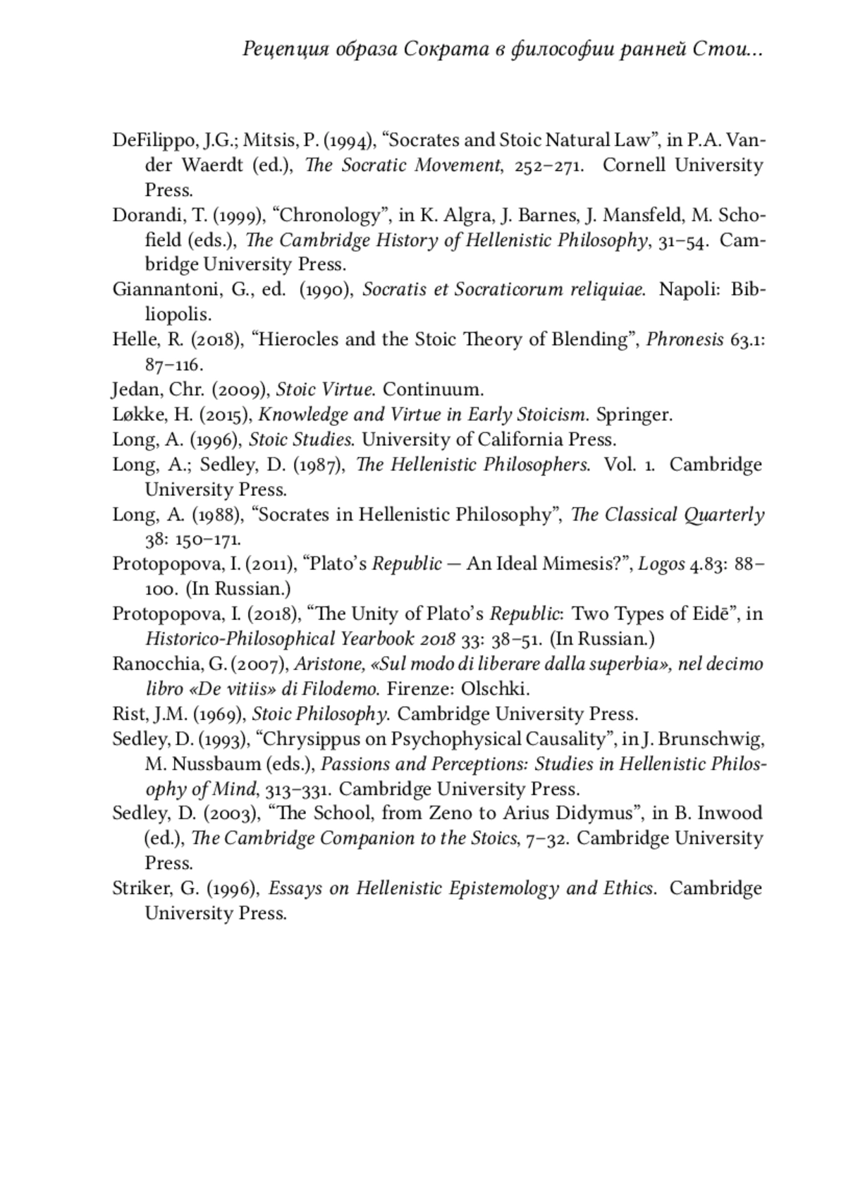 3. Гаджикурбанова, П.А. (2012), Этика Ранней Стои: учение о должном. М.: ИФРАН. EDN: SNCUYR