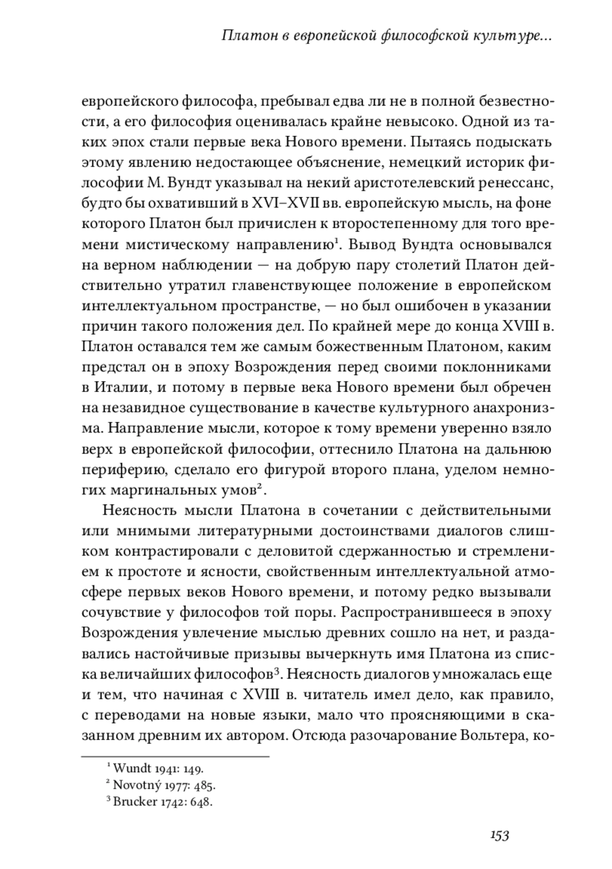 В наши дни может показаться странным, но в истории мысли существовали целые эпохи, когда Платон, прочно утвердившийся в современном сознании в качестве первого по значению европейского философа, пребывал едва ли не в полной безвестности, а его философия оценивалась крайне невысоко. Одной из таких эпох стали первые века Нового времени. Пытаясь подыскать этому явлению недостающее объяснение, немецкий историк философии М. Вундт указывал на некий аристотелевский ренессанс, будто бы охвативший в XVI–XVII вв. европейскую мысль, на фоне которого Платон был причислен к второстепенному для того времени мистическому направлению1. Вывод Вундта основывался на верном наблюдении — на добрую пару столетий Платон действительно утратил главенствующее положение в европейском интеллектуальном пространстве, — но был ошибочен в указании причин такого положения дел. По крайней мере до конца XVIII в. Платон оставался тем же самым божественным Платоном, каким предстал он в эпоху Возрождения перед своими поклонниками в Италии, и потому в первые века Нового времени был обречен на незавидное существование в качестве культурного анахронизма. Направление мысли, которое к тому времени уверенно взяло верх в европейской философии, оттеснило Платона на дальнюю периферию, сделало его фигурой второго плана, уделом немногих маргинальных умов2.