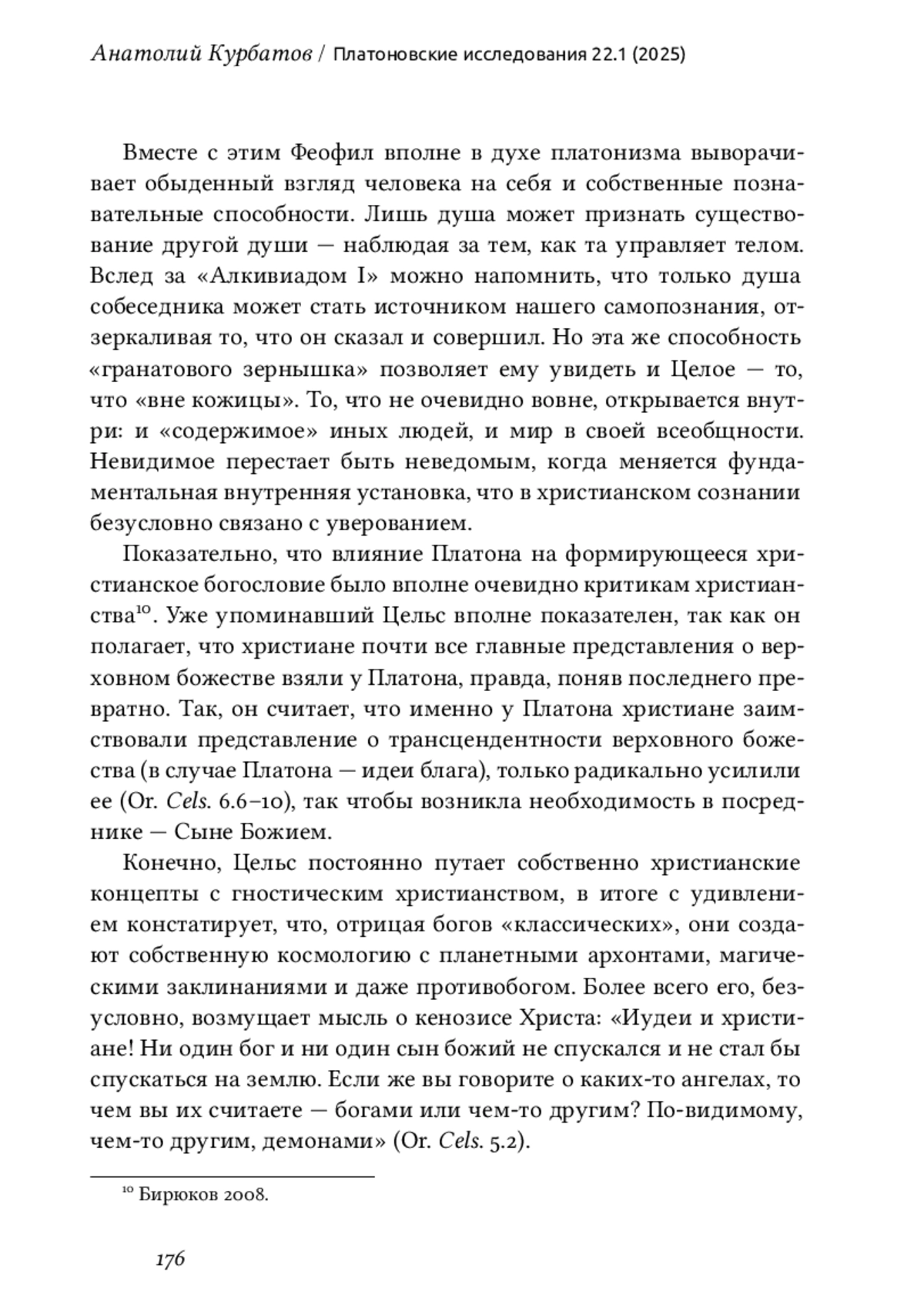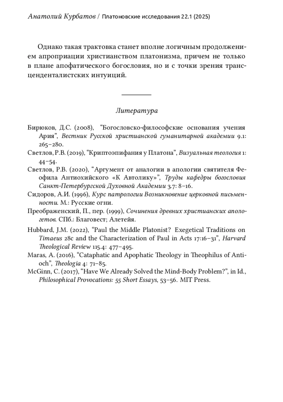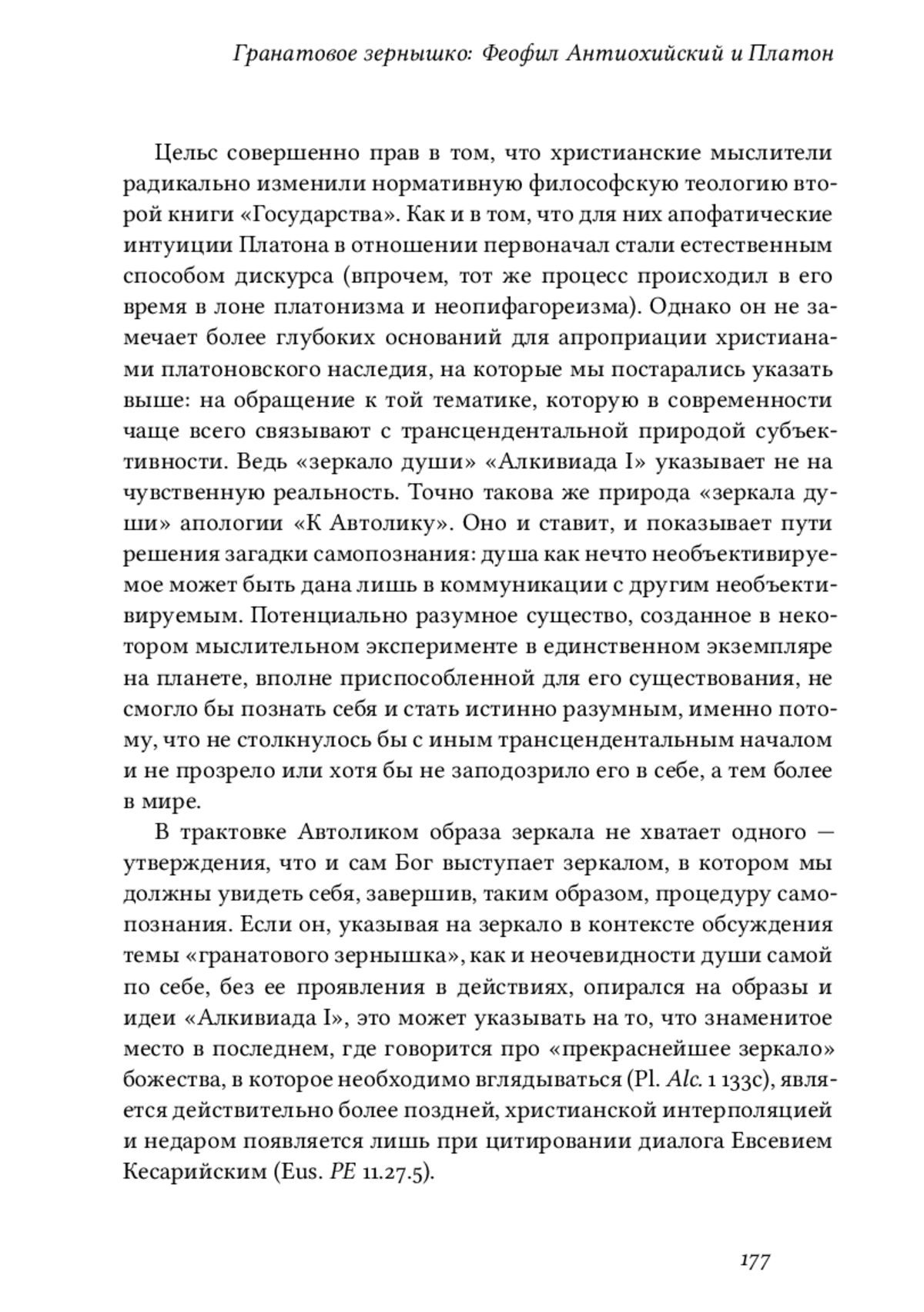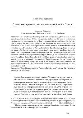 吀栀e article searches for parallels in understanding the essence of selfconsciousness in two texts: Plato’s dialogue Alcibiades I and 吀栀eophilus of Antioch’s Apology to Autolycus. An analysis of these texts supports thq conclusion that the concept of “mirror” in 吀栀eophilus’ apology is not accidental but is formulated within the framework of the ancient philosophical and cultural tradition rooted in the theme of re昀氀ection and self-re昀氀ection in Plato and Aristotle. 吀栀e Christian apologist perceives the nature of self-consciousness as a mirror, in which the subject sees himself and the world. For 吀栀eophilus of Antioch, working within the Christian paradigm, the main condition for self-knowledge and knowledge of what is, is the absence of sin. According to 吀栀eophilus, the intellectual activity that Plato speaks of cannot make a man wise, since the source of wisdom is righteousness. 吀栀eophilus deems that the human soul should be like a shining mirror: the purity of the mirror is a necessary condition for perceiving the re昀氀ection. But sin in man is like rust on a mirror; it prevents the contemplation of God.
