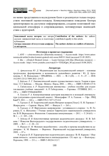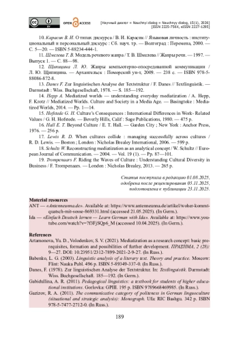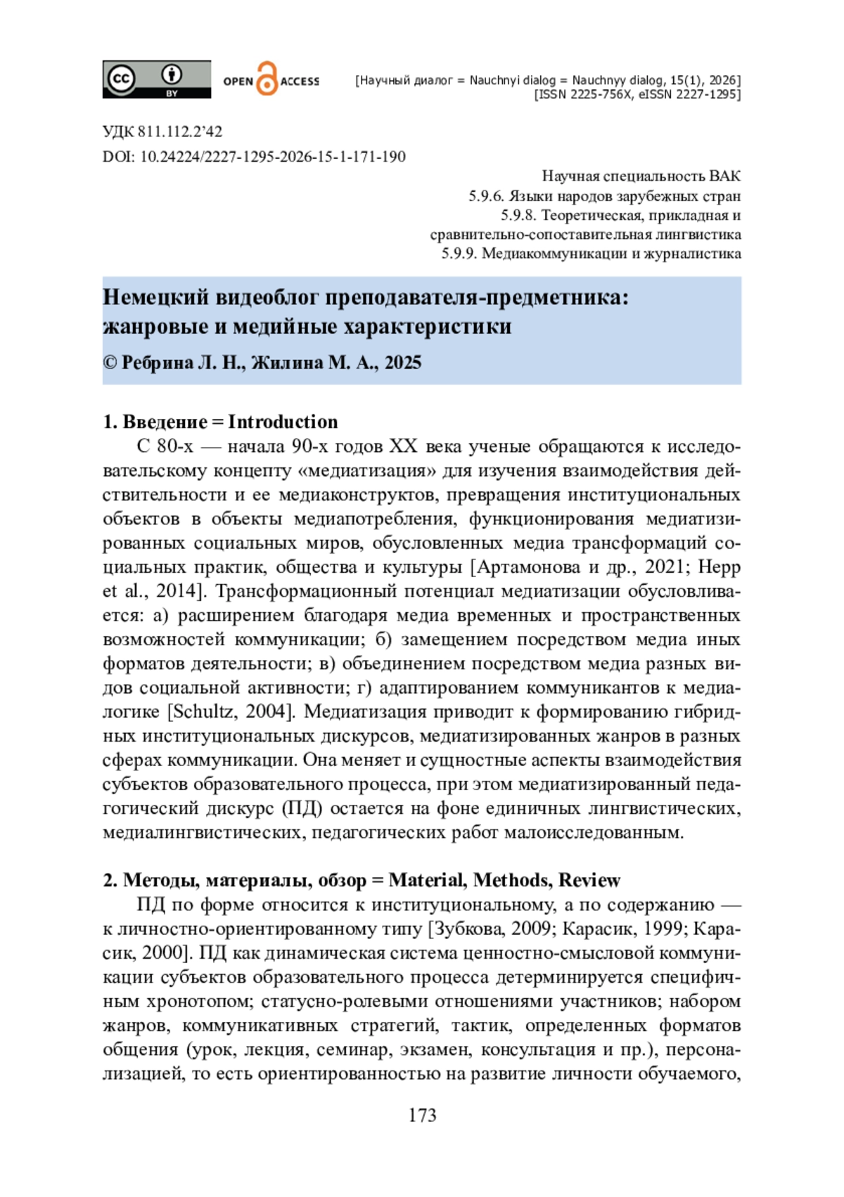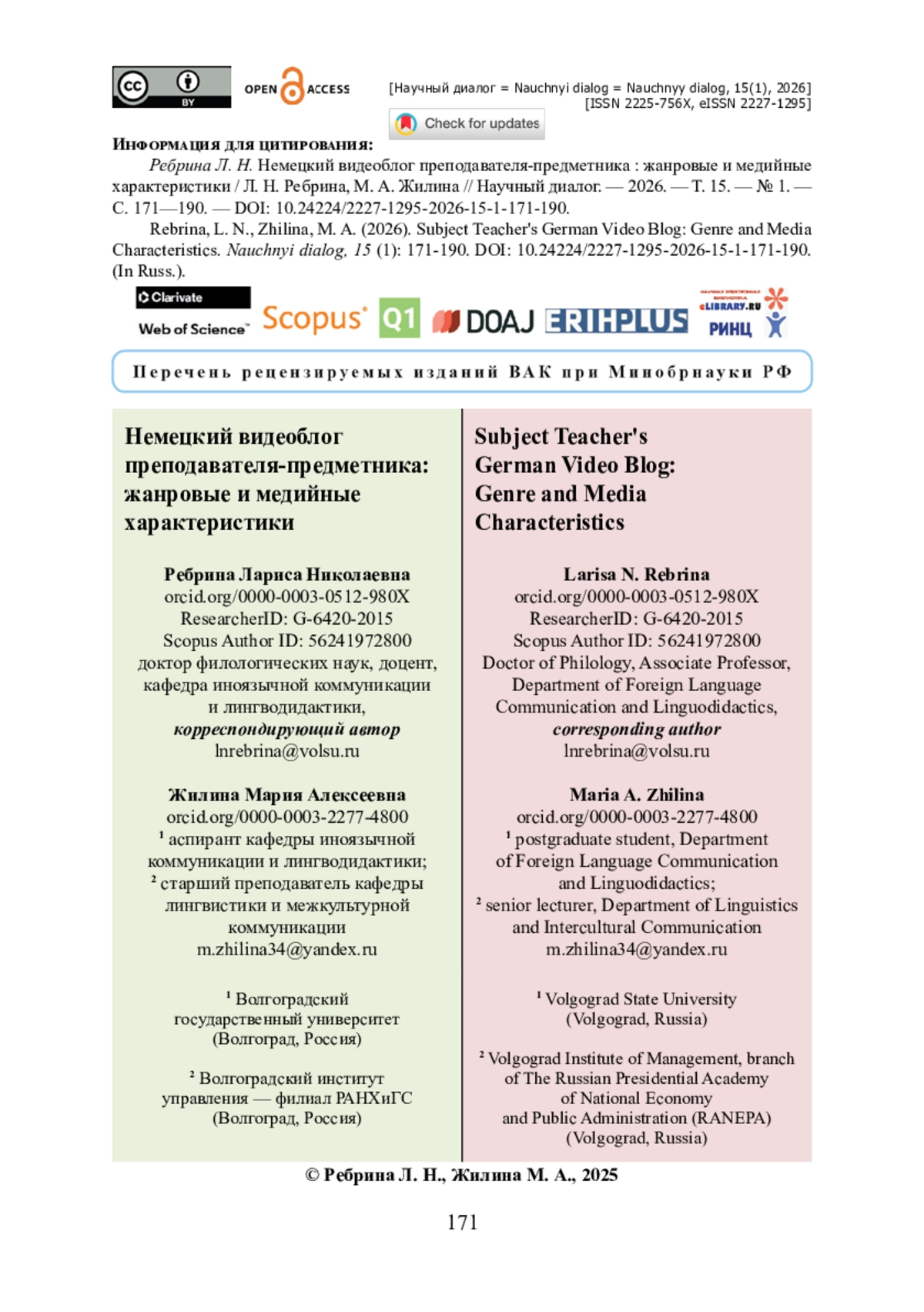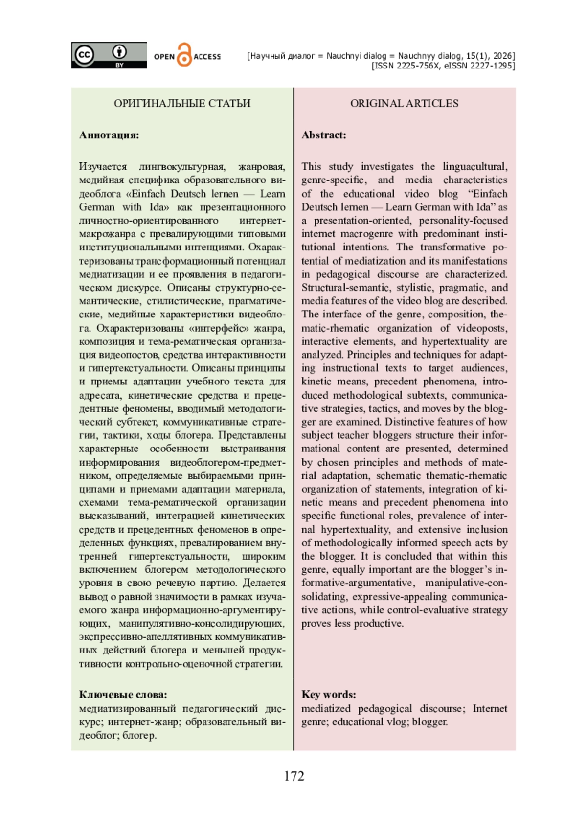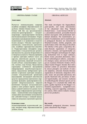 Изучается лингвокультурная, жанровая, медийная специфика образовательного видеоблога «Einfach Deutsch lernen — Learn German with Ida» как презентационного личностно-ориентированного интернет-макрожанра с превалирующими типовыми институциональными интенциями. Охарактеризованы трансформационный потенциал медиатизации и ее проявления в педагогическом дискурсе. Описаны структурно-семантические, стилистические, прагматические, медийные характеристики видеоблога. Охарактеризованы «интерфейс» жанра, композиция и тема-рематическая организация видеопостов, средства интерактивности и гипертекстуальности. Описаны принципы и приемы адаптации учебного текста для адресата, кинетические средства и прецедентные феномены, вводимый методологический субтекст, коммуникативные стратегии, тактики, ходы блогера. Представлены характерные особенности выстраивания информирования видеоблогером-предметником, определяемые выбираемыми принципами и приемами адаптации материала, схемами тема-рематической организации высказываний, интеграцией кинетических средств и прецедентных феноменов в определенных функциях, превалированием внутренней гипертекстуальности, широким включением блогером методологического уровня в свою речевую партию. Делается вывод о равной значимости в рамках изучаемого жанра информационно-аргументирующих, манипулятивно-консолидирующих, экспрессивно-апеллятивных коммуникативных действий блогера и меньшей продуктивности контрольно-оценочной стратегии.