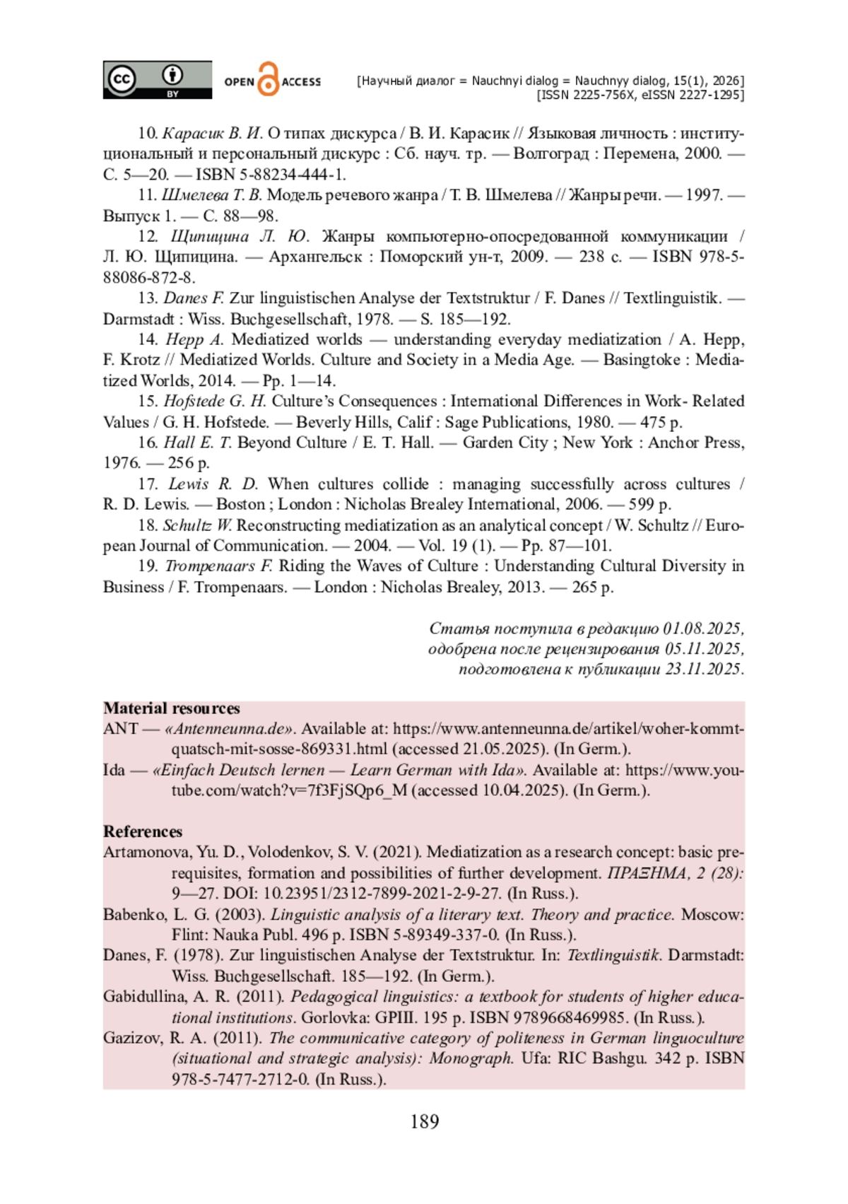 1. Артамонова Ю. Д. Медиатизация как исследовательский концепт : основные предпосылки, формирование и возможности дальнейшего развития / Ю. Д. Артамонова, С. В. Володенков // ΠΡΑΞΗΜΑ. - 2021. - № 2 (28). - С. 9-27. - https://doi.org/10.23951/2312-7899-2021-2-9-27.