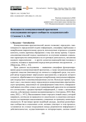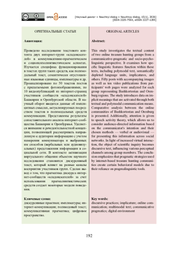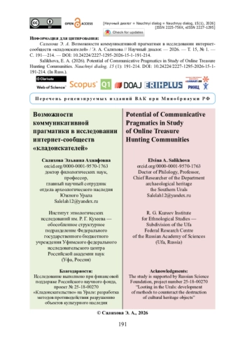 Проведено исследование текстового контента двух интернет-групп «кладоискателей» в коммуникативно-прагматическом и социопсихолингвистическом аспектах. Изучается специфика функционирования в текстах групп таких средств, как полимодальный текст, семантически опустошенные языковые единицы, импликатуры и др. Проанализировано по 50 текстов постов с прилагаемыми фотоизображениями, по 10 видеопубликаций из интернет-страниц участников сообществ «кладоискателей» Башкирии и Оренбургской области. В научный оборот вводятся данные об имплицитных смыслах, актуализируемых посредством текстов и полимодальных средств коммуникации. Представлены результаты сопоставительного анализа интернет-сообщества Башкирии и Оренбуржья. Уделяется внимание и речедеятельностной концепции, позволяющей рассматривать направленную к аудитории информацию с учетом намерения коммуникатора и выбранных им способов (вербальных или аудиовизуальных) представления информации в социальной сети. В контексте активизации виртуального общения объектом научного исследования становится дискурсивный текст, который влияет на разные каналы восприятия участников групп. Сделан вывод о том, что прагматика дискурса интернет-сообществ «кладоискателей» за счет использования прагмалингвистических средств создает некоторые модели поведения.