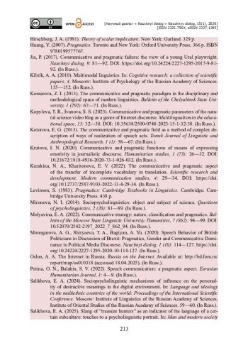 15. Крутова И. Н. Коммуникативно-прагматические функции средств выражения эмотивности в публицистическом дискурсе / И. Н. Крутова // Гуманитарные исследования. - 2020. - № 1 (73). - С. 26-32. - https://doi.org/10.21672/1818-4936-2020-73-1-026-032.