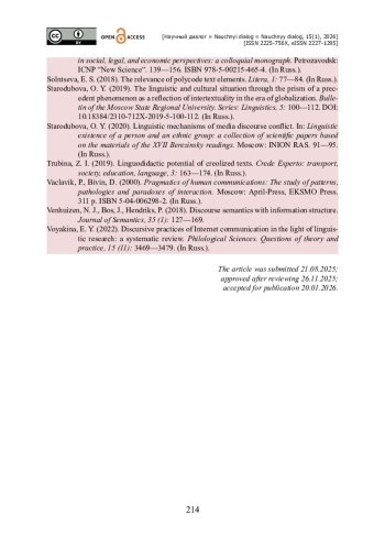 6. Воякина Е. Ю. Дискурсивные практики интернет-коммуникации в свете лингвистических исследований : системный обзор / Е. Ю. Воякина // Филологические науки. Вопросы теории и практики,. - 2022. - Т. 15. - Выпуск 11. - С. 3469-3479.