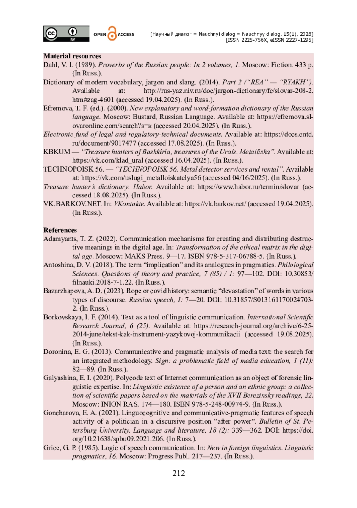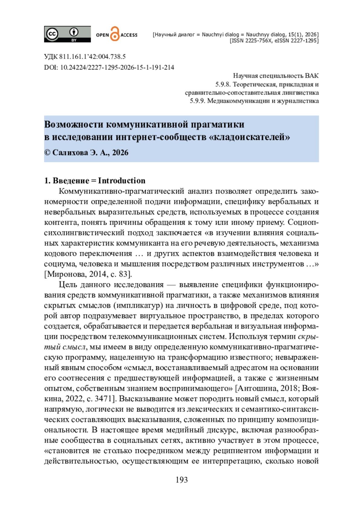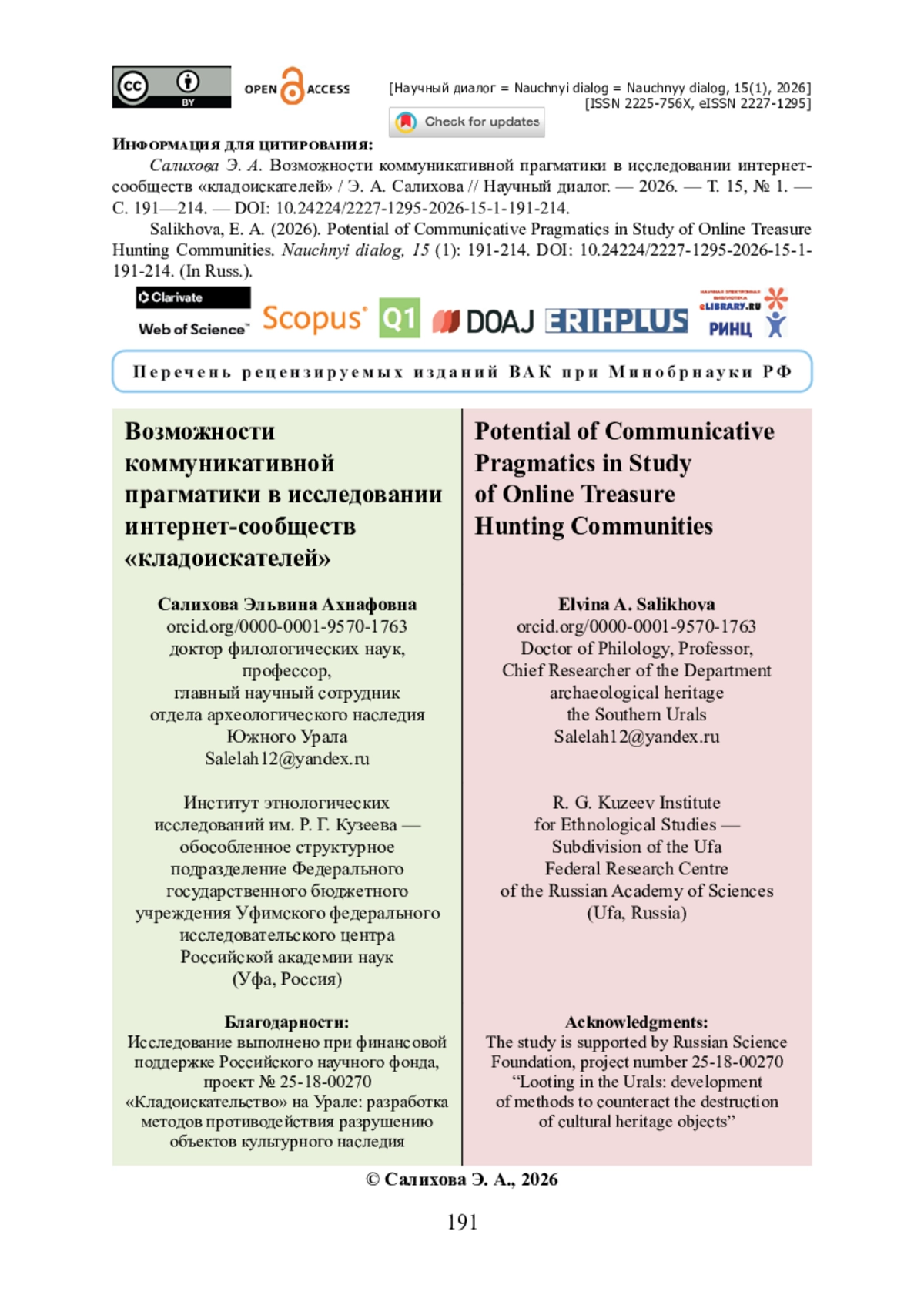 26. Салихова Э. А. Сленг «кладоискателей» как индикатор языка определенной субкультуры: штрихи к психолингвистическому портрету / Э. А. Салихова // Человек и современное общество в социальном, правовом, экономическом ракурсах : колл. монография. - Петрозаводск : МЦНП «Новая наука», 2025. - С. 139-156. - ISBN 978-5-00215-465-4.