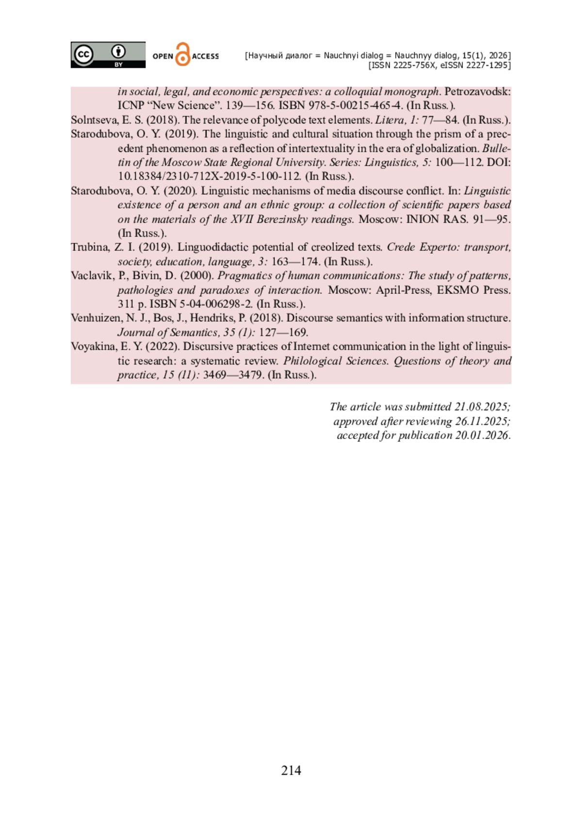 24. Стародубова О. Ю. Лингвистические механизмы конфликтогенности медийного дискурса / О. Ю. Стародубова // Языковое бытие человека и этноса : сборник научных трудов по материалам XVII Березинских чтений. - Москва : ИНИОН РАН. - 2020. - С. 91-95.
