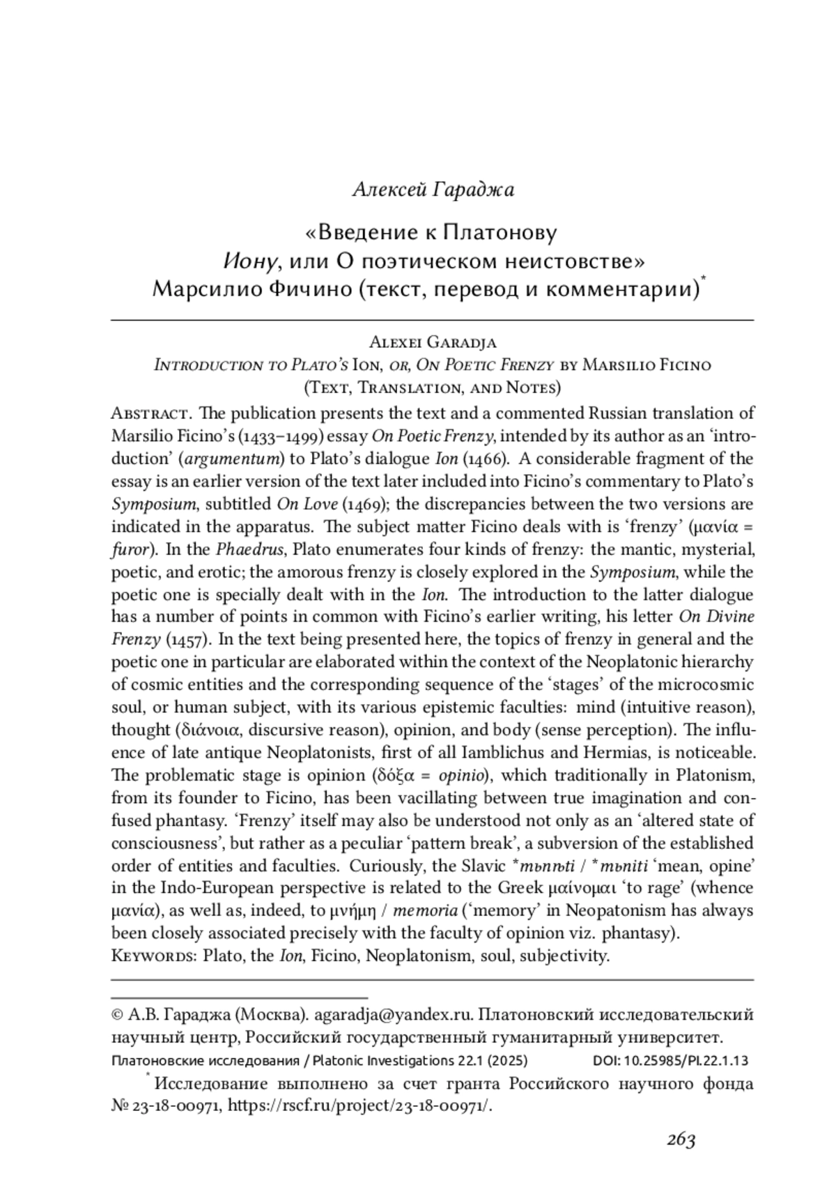 吀栀e publication presents the text and a commented Russian translation of Marsilio Ficino’s (1433–1499) essay On Poetic Frenzy, intended by its author as an ‘introduction’ (argumentum) to Plato’s dialogue Ion (1466). A considerable fragment of the essay is an earlier version of the text later included into Ficino’s commentary to Plato’s Symposium, subtitled On Love (1469); the discrepancies between the two versions are indicated in the apparatus. 吀栀e subject ma琀琀er Ficino deals with is ‘frenzy’ (μανία = furor). In the Phaedrus, Plato enumerates four kinds of frenzy: the mantic, mysterial, poetic, and erotic; the amorous frenzy is closely explored in the Symposium, while the poetic one is specially dealt with in the Ion. 吀栀e introduction to the la琀琀er dialogue has a number of points in common with Ficino’s earlier writing, his le琀琀er On Divine Frenzy (1457). In the text being presented here, the topics of frenzy in general and the poetic one in particular are elaborated within the context of the Neoplatonic hierarchy of cosmic entities and the corresponding sequence of the ‘stages’ of the microcosmic soul, or human subject, with its various epistemic faculties: mind (intuitive reason), thought (διάνοια, discursive reason), opinion, and body (sense perception). 吀栀e in昀氀uence of late antique Neoplatonists, 昀椀rst of all Iamblichus and Hermias, is noticeable. 吀栀e problematic stage is opinion (δόξα = opinio), which traditionally in Platonism, from its founder to Ficino, has been vacillating between true imagination and confused phantasy. ‘Frenzy’ itself may also be understood not only as an ‘altered state of consciousness’, but rather as a peculiar ‘pa琀琀ern break’, a subversion of the established order of entities and faculties. Curiously, the Slavic *mьnѣti / *mьniti ‘mean, opine’ in the Indo-European perspective is related to the Greek μαίνομαι ‘to rage’ (whence μανία), as well as, indeed, to μνήμη / memoria (‘memory’ in Neopatonism has always been closely associated precisely with the faculty of opinion viz. phantasy).