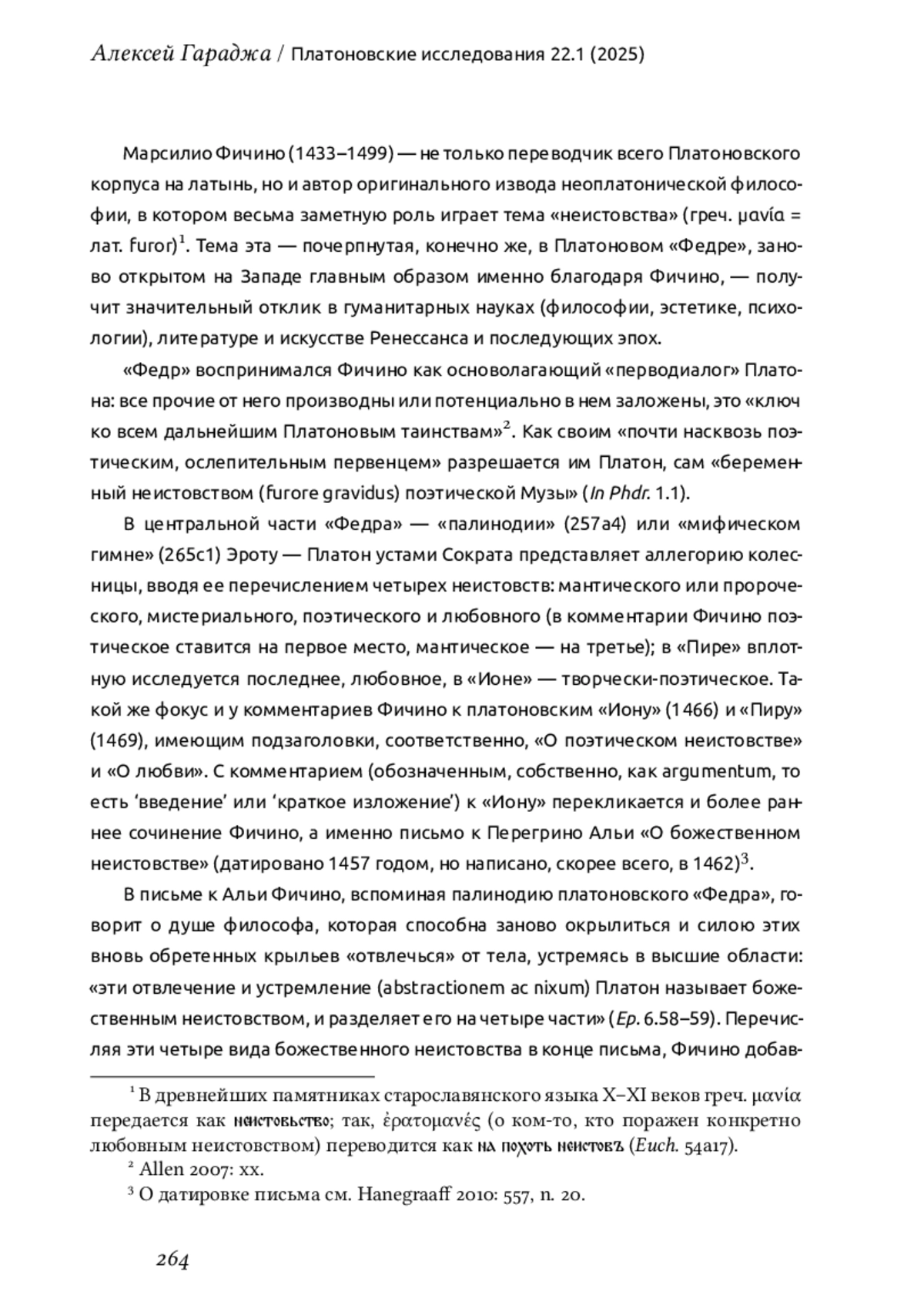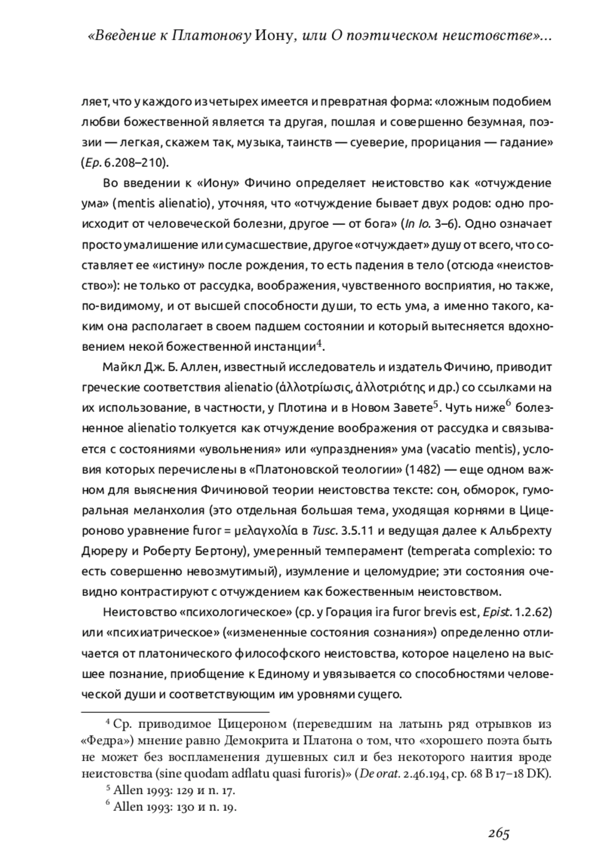 Марсилио Фичино (1433–1499) — не только переводчик всего Платоновского корпуса на латынь, но и автор оригинального извода неоплатонической философии, в котором весьма заметную роль играет тема «неистовства» (греч. μανία = лат. furor)1. Тема эта — почерпнутая, конечно же, в Платоновом «Федре», заново открытом на Западе главным образом именно благодаря Фичино, — получит значительный отклик в гуманитарных науках (философии, эстетике, психологии), литературе и искусстве Ренессанса и последующих эпох.