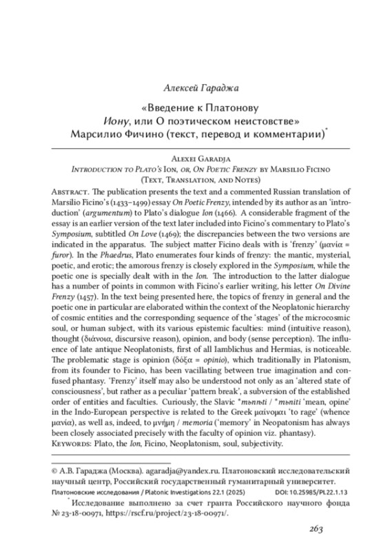 В публикации представлены текст и комментированный русский перевод эссе Марсилио Фичино (1433-1499) «О поэтическом неистовстве» (1466), выполнявшего роль «введения» (argumentum) к платоновскому диалогу «Ион». Значительный фрагмент эссе представляет собой раннюю версию текста, позже включенного в комментарий Фичино к «Пиру» - «О любви» (1469): разночтения между двумя версиями отмечены в аппарате. Предмет обсуждения Фичино, как явствует из заголовка, - «неистовство» (μανία = furor). В «Федре» Платон перечисляет неистовства четырех видов: мантическое, мистериальное, поэтическое и эротическое (у Фичино поэтическое ставится на первое место, а мантическое - на третье); в «Пире» вплотную исследуется последнее, любовное, в «Ионе» - творчески-поэтическое. С введением к «Иону» перекликается более раннее сочинение Фичино - письмо «О божественном неистовстве» (1457). В нашем тексте тема неистовства вообще и поэтического в частности разрабатывается в привязке к неоплатонической иерархии мировых сущностей и соответствующей последовательности «ступеней» микрокосма - познавательных сил человеческой «души», то есть субъекта: ум (интуитивный разум), мышление или рассудок (διάνοια, дискурсивный разум), мнение, тело (чувственное восприятие). Отмечается влияние позднеантичных неоплатоников, в первую очередь Ямвлиха и Гермия. Проблемная ступень - мнение (δόξα = opinio), традиционно в платонизме от Платона до Фичино двоившееся на истинное представление-воображение и ложную фантазию. «Неистовство» тоже можно воспринимать не просто как «измененное состояние сознания», но и как своеобразный «разрыв шаблона». Интересно, что слав. *mьnѣti / *mьniti ‘мнить’ в индоевропейской перспективе родственно греч. μαίνομαι ‘неистовствовать’ (откуда μανία) - как, впрочем, и μνήμη / memoria (‘память’, которая в неоплатонизме тесно связывалась как раз со «ступенью» мнения-воображения).