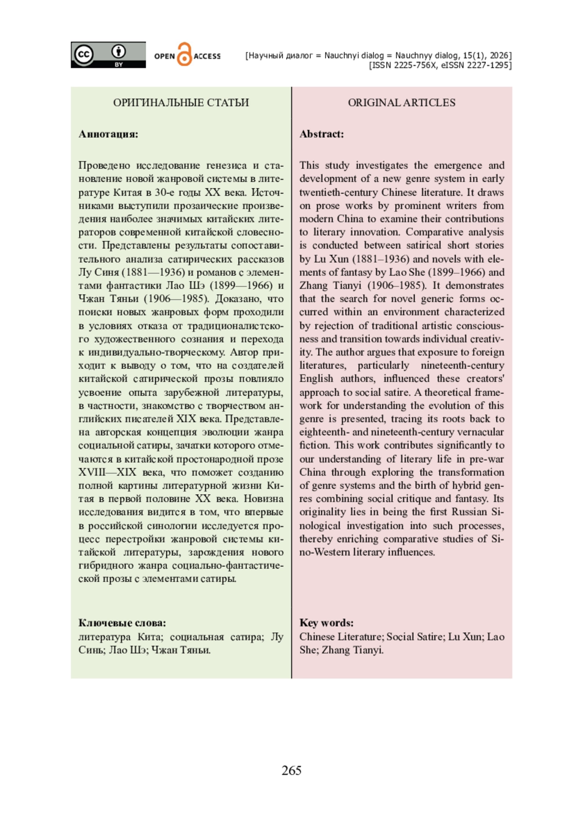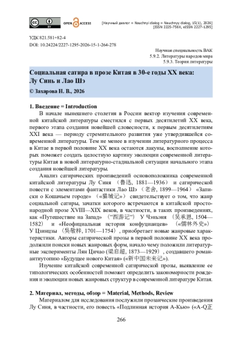 Проведено исследование генезиса и становление новой жанровой системы в литературе Китая в 30-е годы ХХ века. Источниками выступили прозаические произведения наиболее значимых китайских литераторов современной китайской словесности. Представлены результаты сопоставительного анализа сатирических рассказов Лу Синя (1881—1936) и романов с элементами фантастики Лао Шэ (1899—1966) и Чжан Тяньи (1906—1985). Доказано, что поиски новых жанровых форм проходили в условиях отказа от традиционалистского художественного сознания и перехода к индивидуально-творческому. Автор приходит к выводу о том, что на создателей китайской сатирической прозы повлияло усвоение опыта зарубежной литературы, в частности, знакомство с творчеством английских писателей XIX века. Представлена авторская концепция эволюции жанра социальной сатиры, зачатки которого отмечаются в китайской простонародной прозе XVIII—XIX века, что поможет созданию полной картины литературной жизни Китая в первой половине ХХ века. Новизна исследования видится в том, что впервые в российской синологии исследуется процесс перестройки жанровой системы китайской литературы, зарождения нового гибридного жанра социально-фантастической прозы с элементами сатиры.