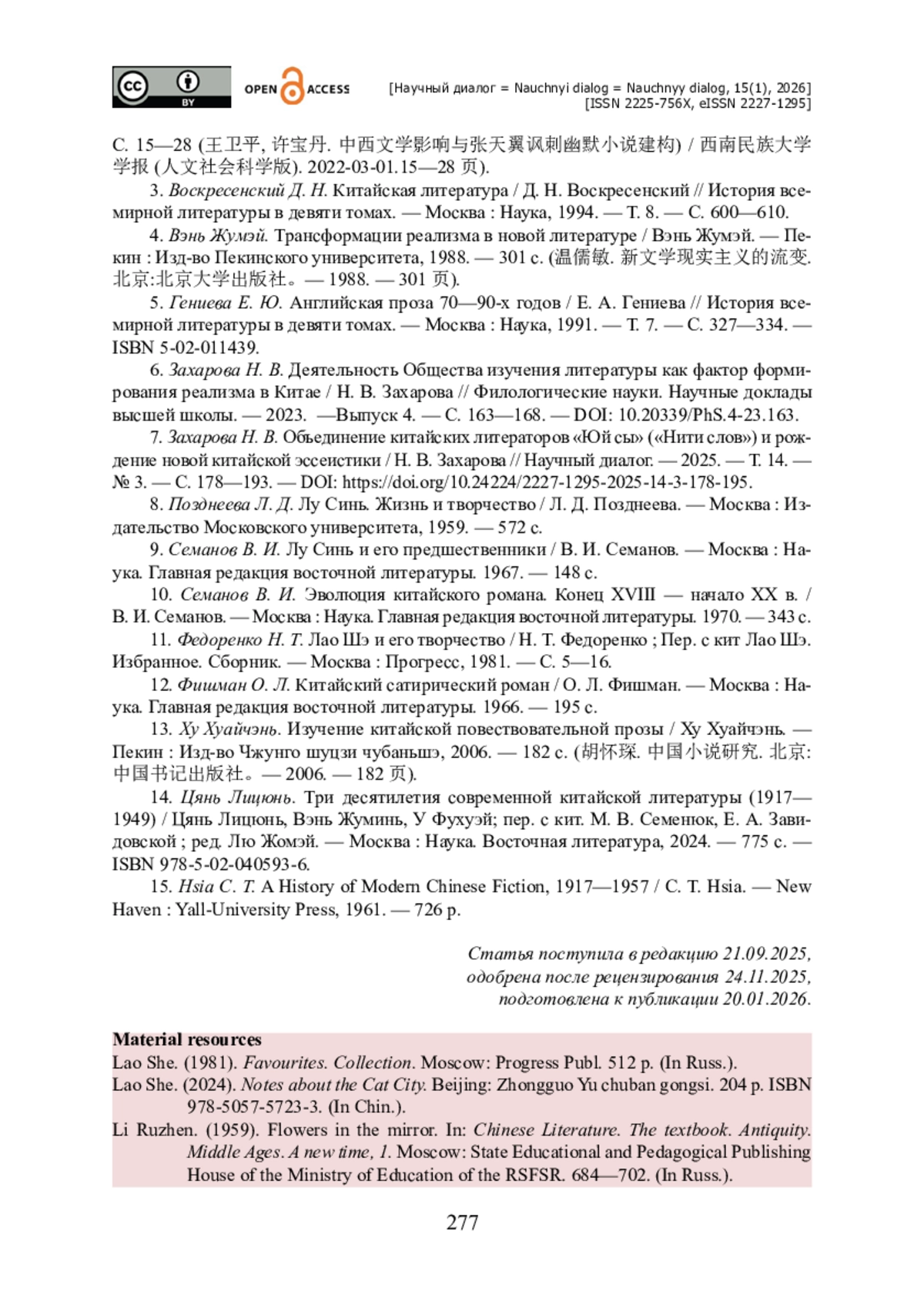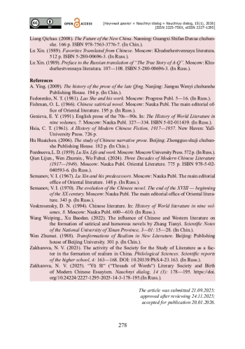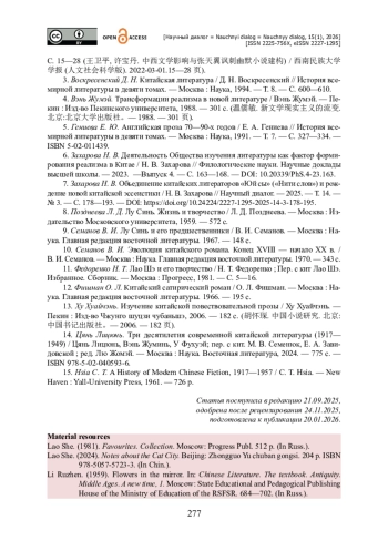 7. Захарова Н. В. Объединение китайских литераторов «Юй сы» («Нити слов») и рождение новой китайской эссеистики / Н. В. Захарова // Научный диалог. - 2025. - Т. 14. - № 3. - С. 178-193. - https://doi.org/10.24224/2227-1295-2025-14-3-178-195.