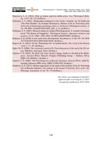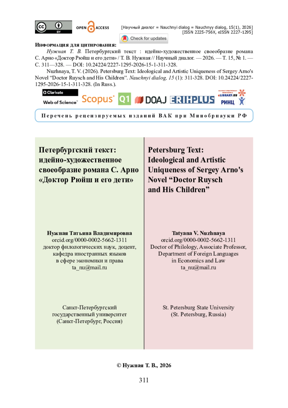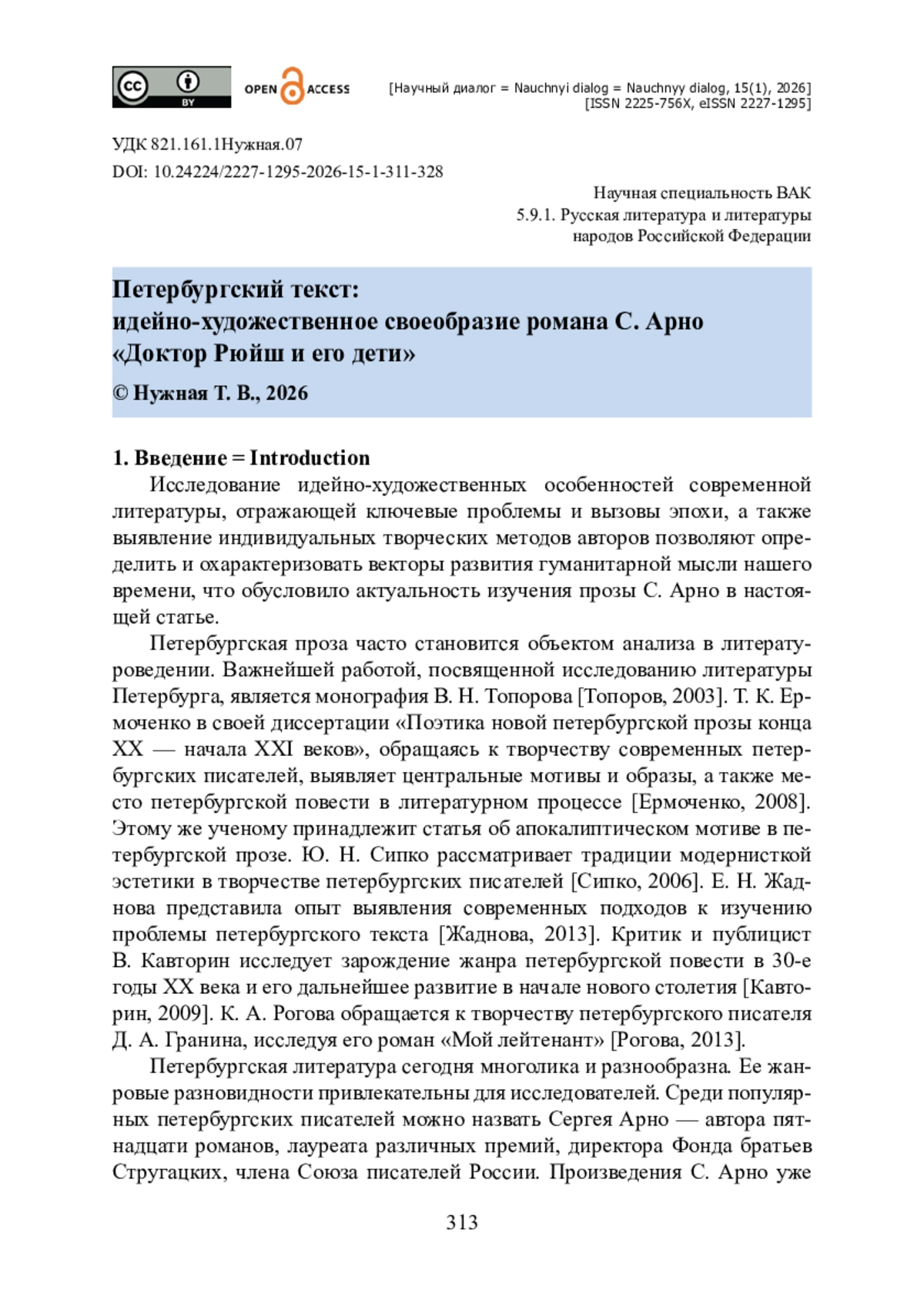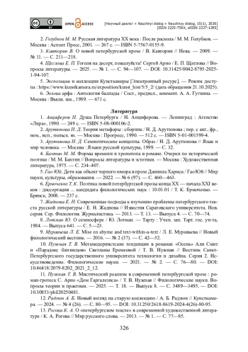 11. Нужная Т. В. Мистический реализм в современной петербургской прозе : роман-гротеск С. Арно «Дом Гаргалезиса» / Т. В. Нужная // Филологические науки. Вопросы теории и практики. - 2025. - Т. 18. - Выпуск 8. - С. 3489-3495. - https://doi.org/10.30853/phil20250481.