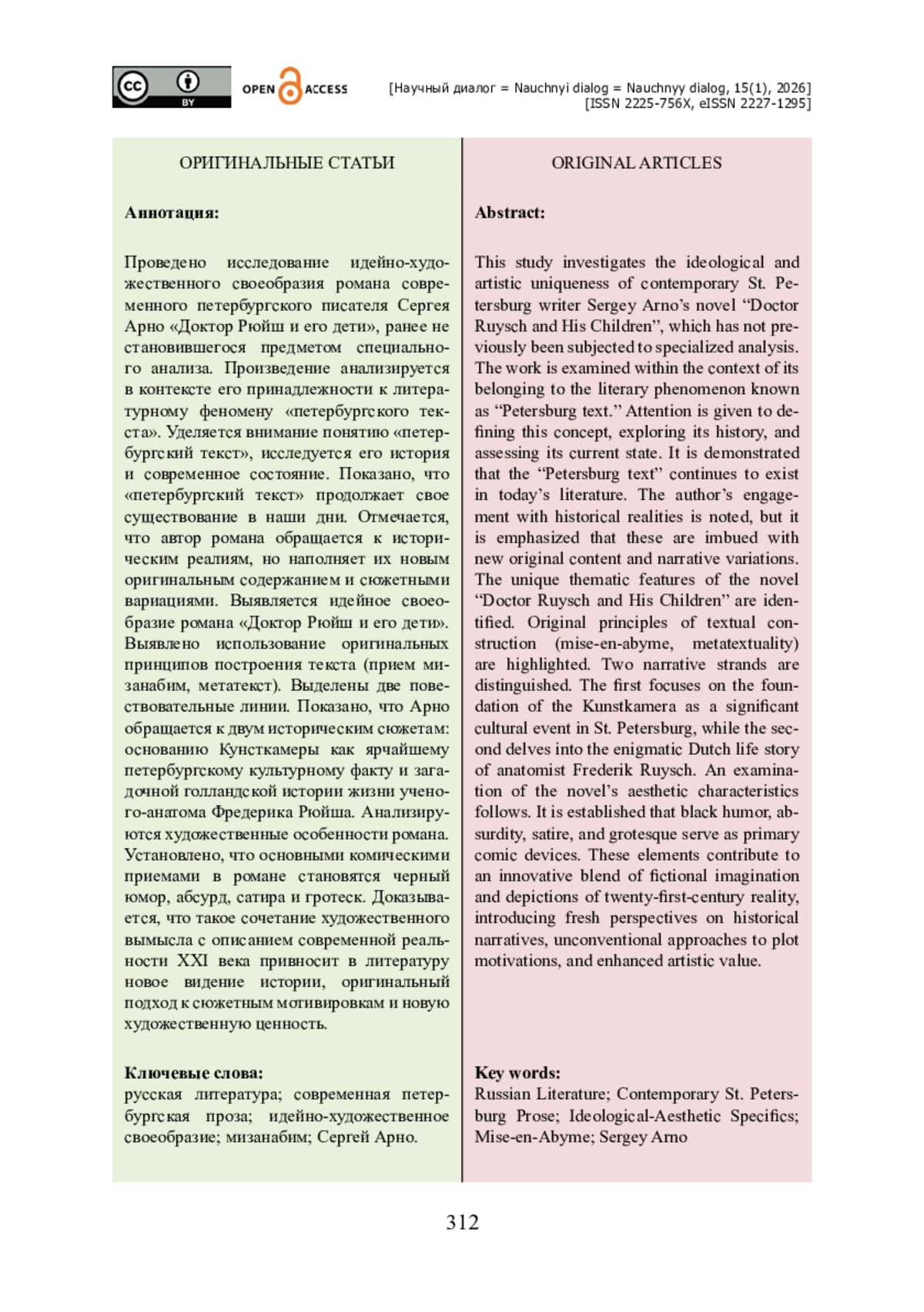 Проведено исследование идейно-художественного своеобразия романа современного петербургского писателя Сергея Арно «Доктор Рюйш и его дети», ранее не становившегося предметом специального анализа. Произведение анализируется в контексте его принадлежности к литературному феномену «петербургского текста». Уделяется внимание понятию «петербургский текст», исследуется его история и современное состояние. Показано, что «петербургский текст» продолжает свое существование в наши дни. Отмечается, что автор романа обращается к историческим реалиям, но наполняет их новым оригинальным содержанием и сюжетными вариациями. Выявляется идейное своеобразие романа «Доктор Рюйш и его дети». Выявлено использование оригинальных принципов построения текста (прием мизанабим, метатекст). Выделены две повествовательные линии. Показано, что Арно обращается к двум историческим сюжетам: основанию Кунсткамеры как ярчайшему петербургскому культурному факту и загадочной голландской истории жизни ученого-анатома Фредерика Рюйша. Анализируются художественные особенности романа. Установлено, что основными комическими приемами в романе становятся черный юмор, абсурд, сатира и гротеск. Доказывается, что такое сочетание художественного вымысла с описанием современной реальности XXI века привносит в литературу новое видение истории, оригинальный подход к сюжетным мотивировкам и новую художественную ценность.
