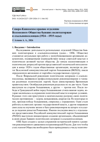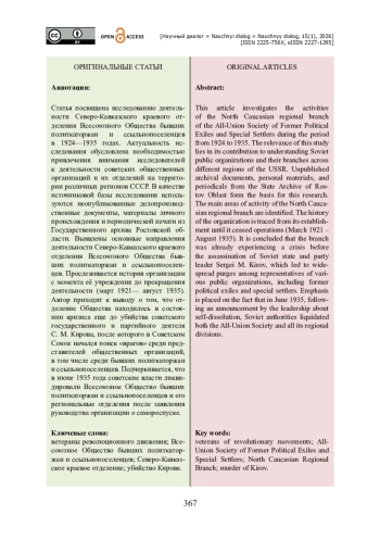 Статья посвящена исследованию деятельности Северо-Кавказского краевого отделения Всесоюзного Общества бывших политкаторжан и ссыльнопоселенцев в 1924—1935 годах. Актуальность исследования обусловлена необходимостью привлечения внимания исследователей к деятельности советских общественных организаций и их отделений на территории различных регионов СССР. В качестве источниковой базы исследования используются неопубликованные делопроизводственные документы, материалы личного происхождения и периодической печати из Государственного архива Ростовской области. Выявлены основные направления деятельности Северо-Кавказского краевого отделения Всесоюзного Общества бывших политкаторжан и ссыльнопоселенцев. Прослеживается история организации с момента её учреждения до прекращения деятельности (март 1921— август 1935). Автор приходит к выводу о том, что отделение Общества находилось в состоянии кризиса еще до убийства советского государственного и партийного деятеля С. М. Кирова, после которого в Советском Союзе начался поиск «врагов» среди представителей общественных организаций, в том числе среди бывших политкаторжан и ссыльнопоселенцев. Подчеркивается, что в июне 1935 года советские власти ликвидировали Всесоюзное Общество бывших политкаторжан и ссыльнопоселенцев и его региональные отделения после заявления руководства организации о самороспуске.