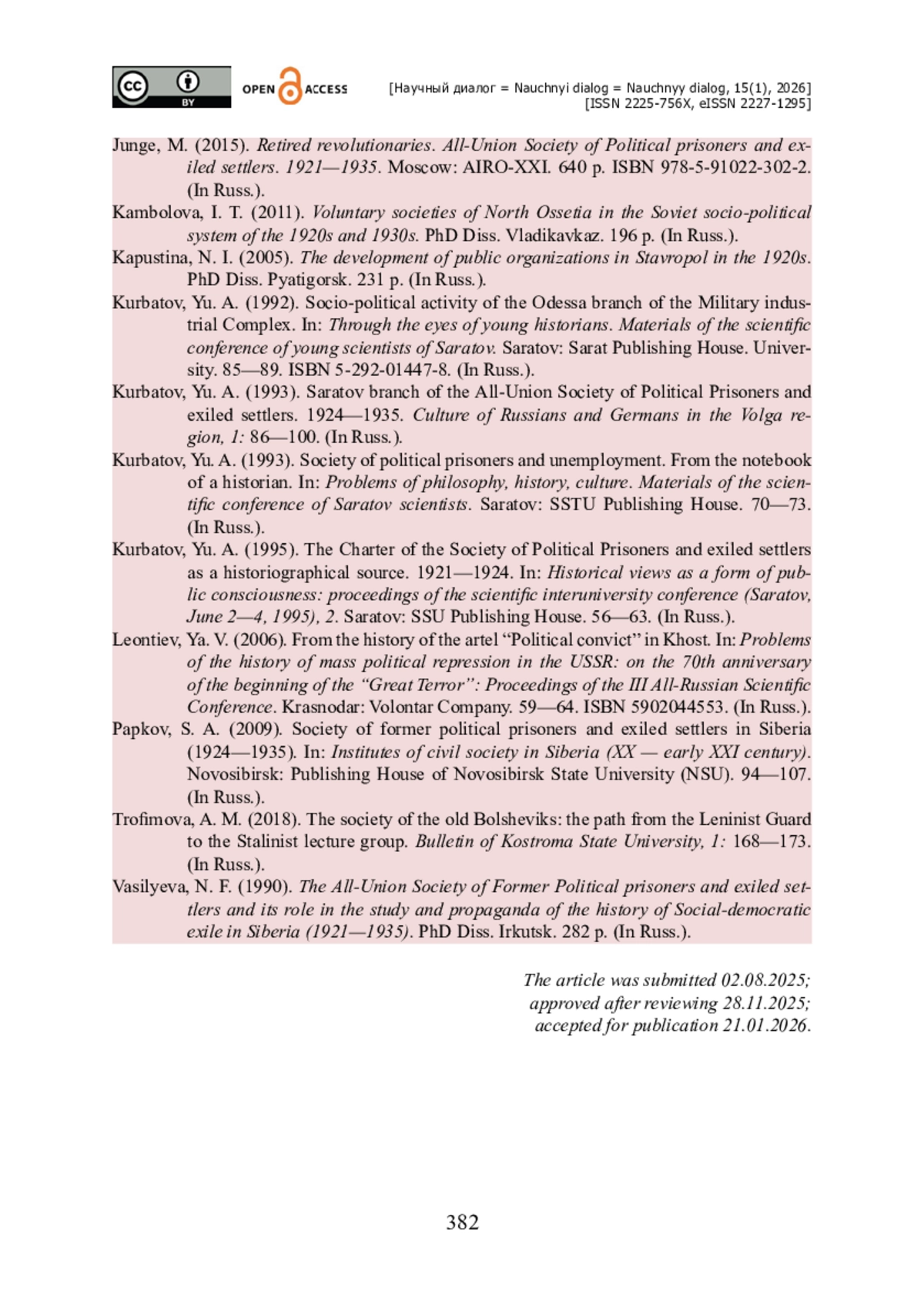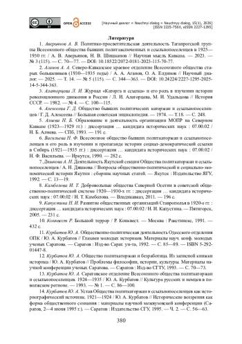 1. Аверьянов А. В. Политико-просветительская деятельность Таганрогской группы Всесоюзного общества бывших политзаключенных и ссыльнопоселенцев в 1925-1930 гг. / А. В. Аверьянов, Н. В. Шишканов // Научная мысль Кавказа. - 2023. - № 3 (115). - С. 70-77. - https://doi.org/10.18522/2072-0181-2023-115-70-77.