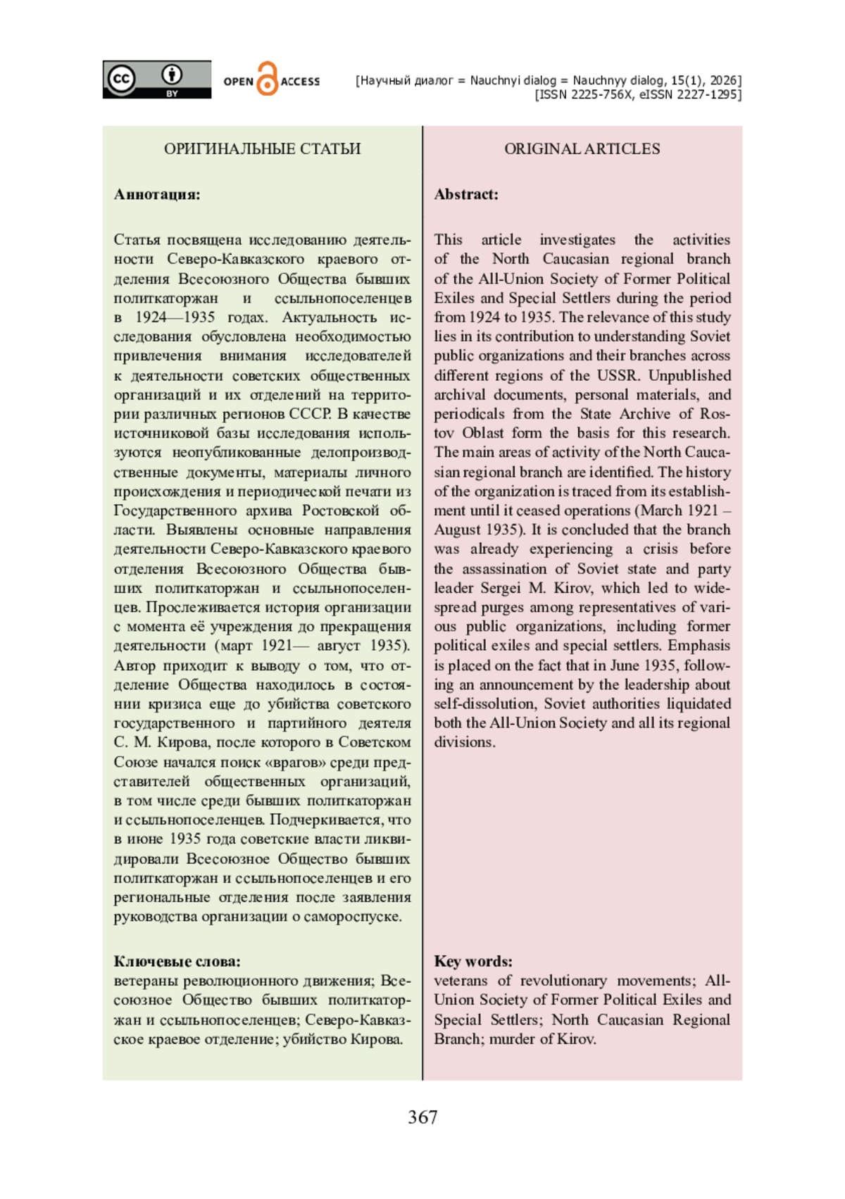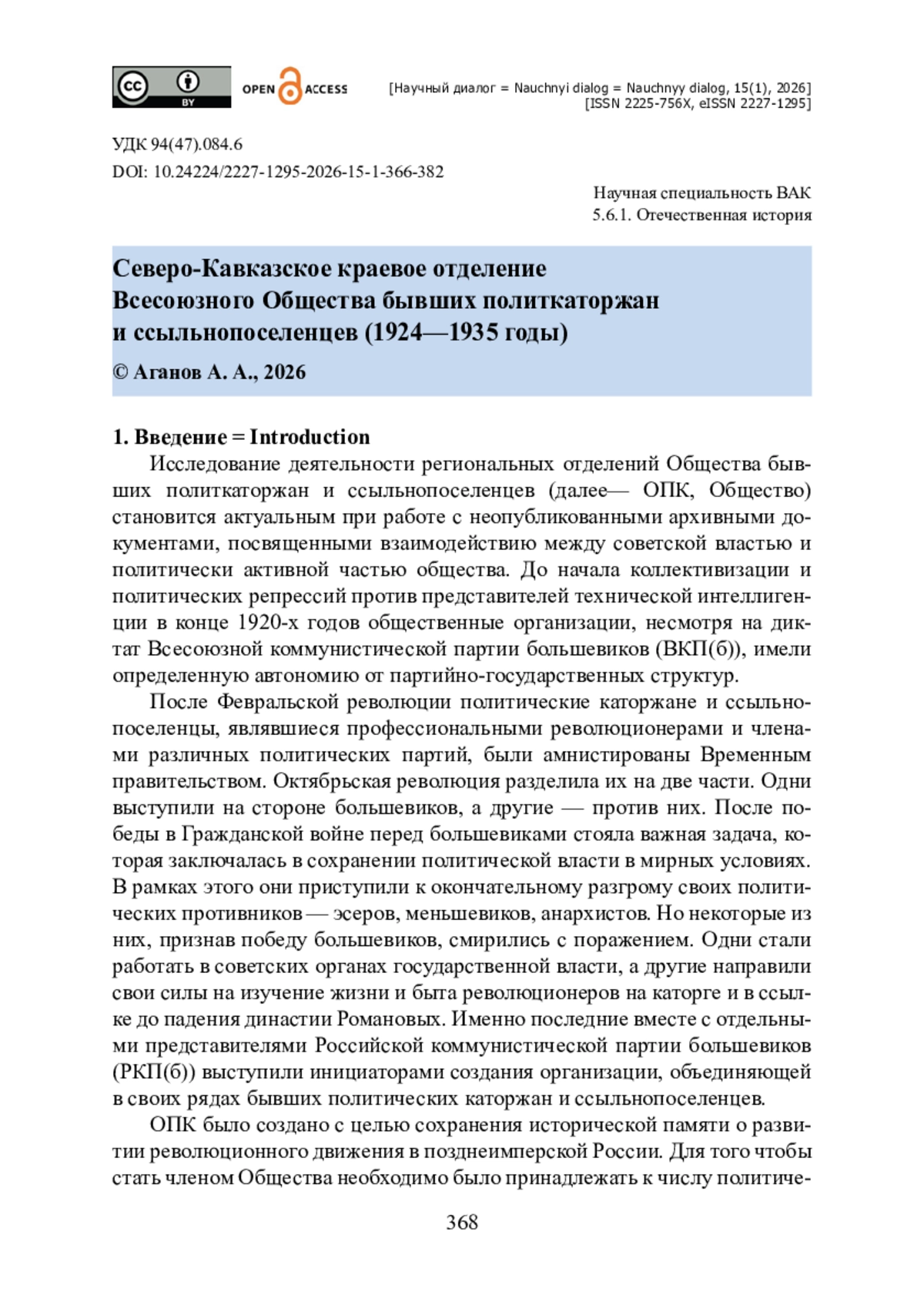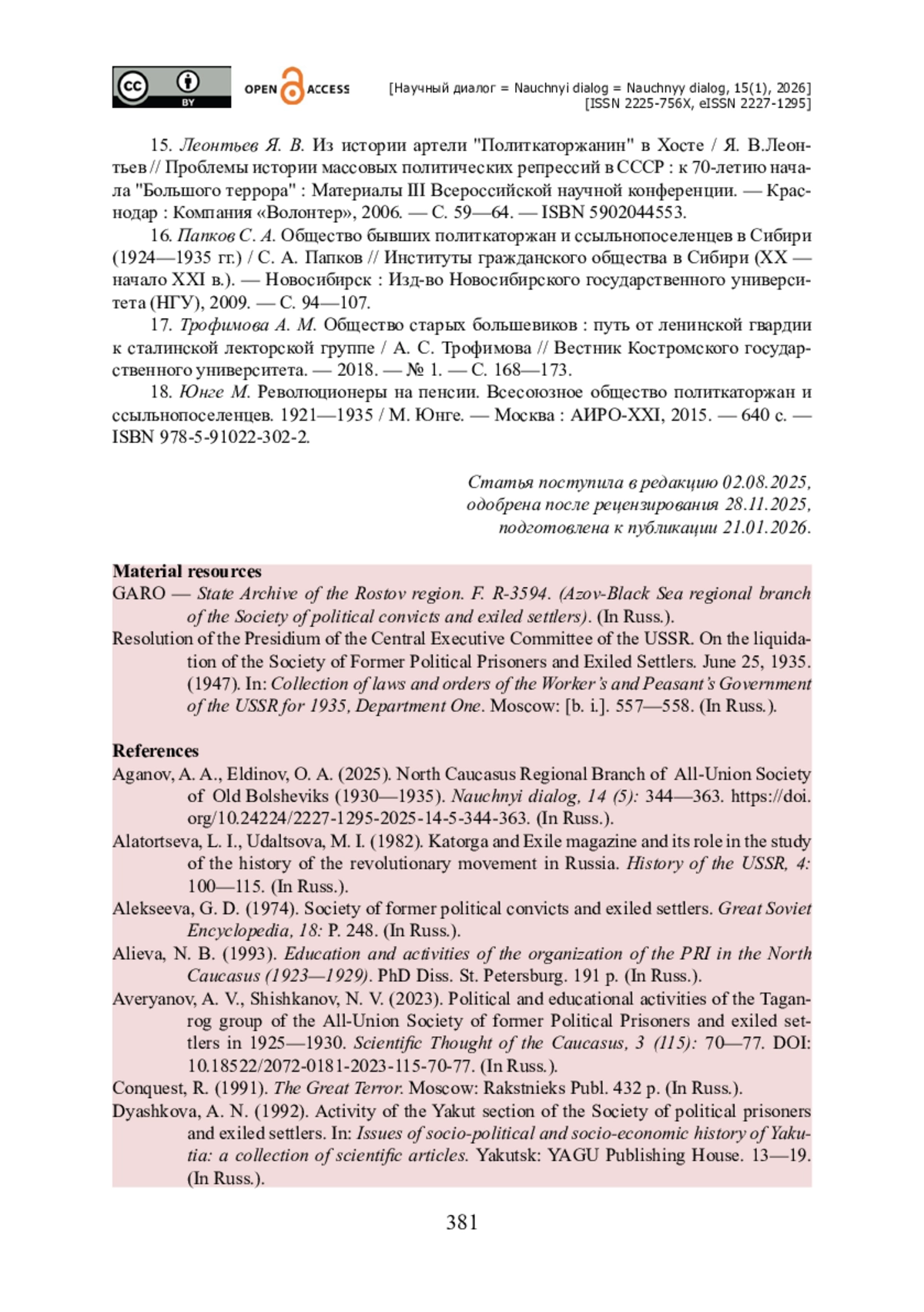 2. Аганов А. А. Северо-Кавказское краевое отделение Всесоюзного общества старых большевиков (1930-1935 годы) / А. А. Аганов, О. А. Елдинов // Научный диалог. - 2025. - Т. 14. - № 5 (115). - С. 344-363. - https://doi.org/10.24224/2227-1295-2025-14-5-344-363.