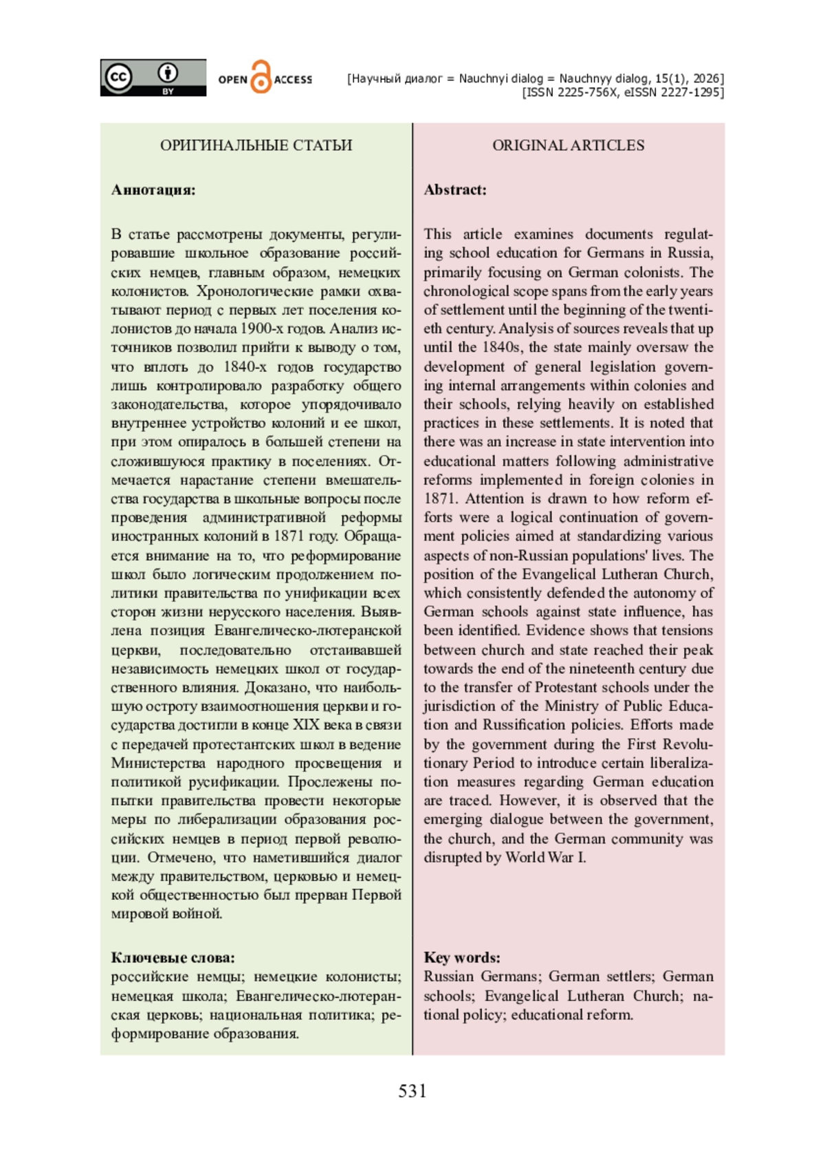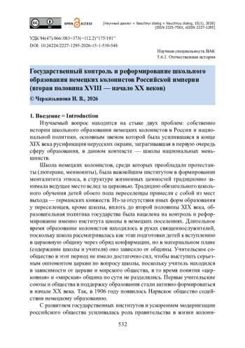 В статье рассмотрены документы, регулировавшие школьное образование российских немцев, главным образом, немецких колонистов. Хронологические рамки охватывают период с первых лет поселения колонистов до начала 1900-х годов. Анализ источников позволил прийти к выводу о том, что вплоть до 1840-х годов государство лишь контролировало разработку общего законодательства, которое упорядочивало внутреннее устройство колоний и ее школ, при этом опиралось в большей степени на сложившуюся практику в поселениях. Отмечается нарастание степени вмешательства государства в школьные вопросы после проведения административной реформы иностранных колоний в 1871 году. Обращается внимание на то, что реформирование школ было логическим продолжением политики правительства по унификации всех сторон жизни нерусского населения. Выявлена позиция Евангелическо-лютеранской церкви, последовательно отстаивавшей независимость немецких школ от государственного влияния. Доказано, что наибольшую остроту взаимоотношения церкви и государства достигли в конце XIX века в связи с передачей протестантских школ в ведение Министерства народного просвещения и политикой русификации. Прослежены попытки правительства провести некоторые меры по либерализации образования российских немцев в период первой революции. Отмечено, что наметившийся диалог между правительством, церковью и немецкой общественностью был прерван Первой мировой войной.