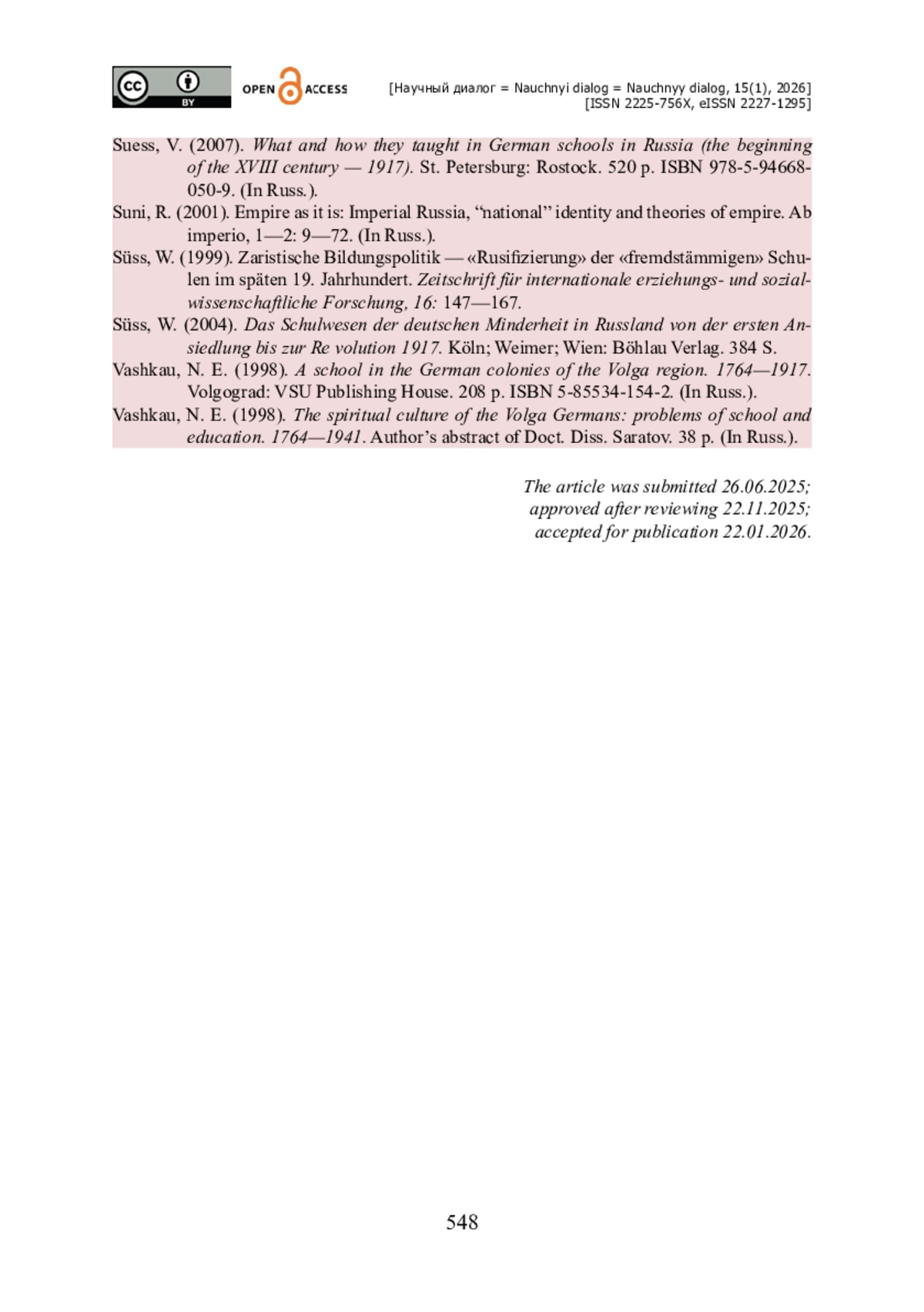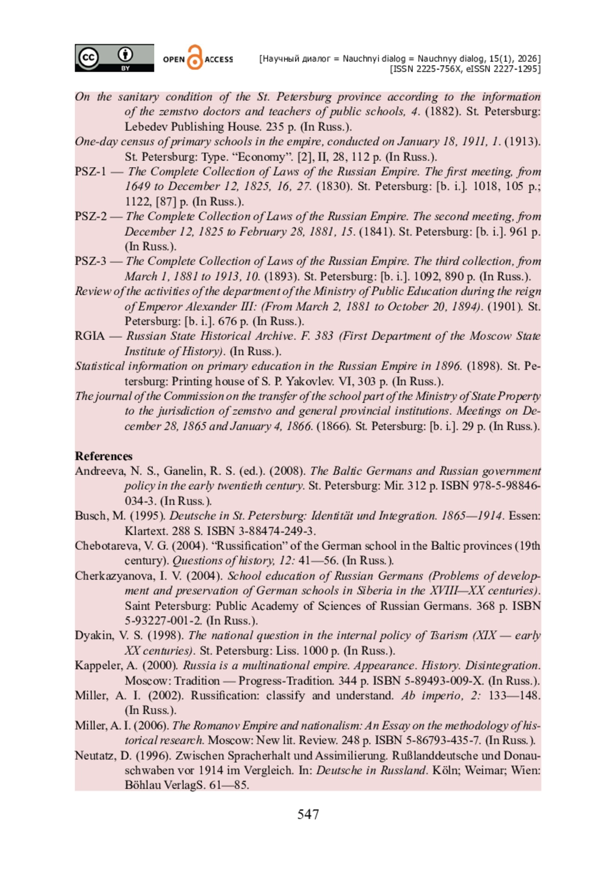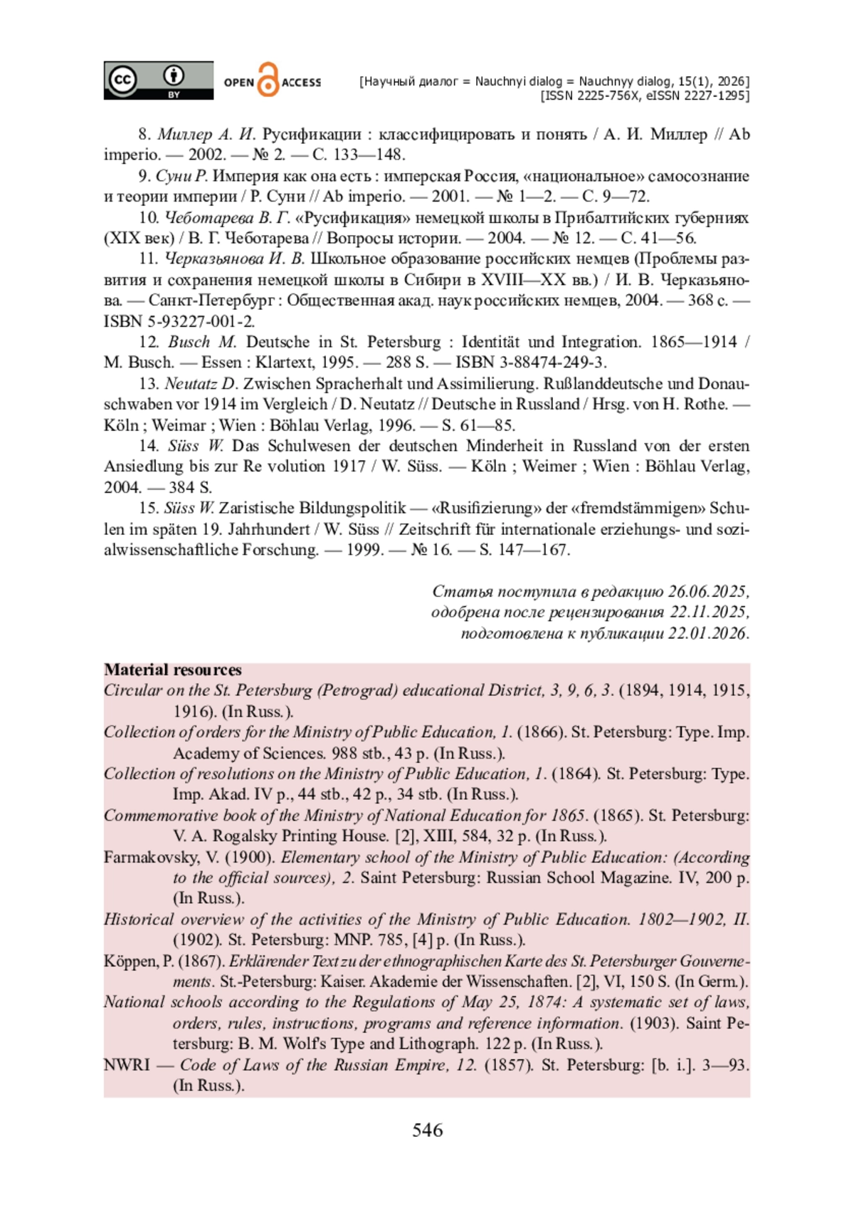 15. Süss W. Zaristische Bildungspolitik - «Rusifizierung» der «fremdstämmigen» Schulen im späten 19. Jahrhundert / W. Süss // Zeitschrift für internationale erziehungs- und sozialwissenschaftliche Forschung. - 1999. - № 16. - S. 147-167.