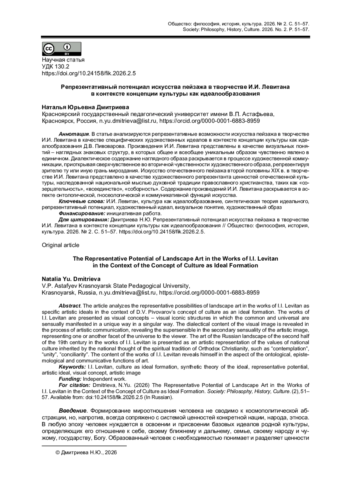 В статье анализируются репрезентативные возможности искусства пейзажа в творчестве И. И. Левитана в качестве специфических художественных идеалов в контексте концепции культуры как идеалообразования Д. В. Пивоварова. Произведения И. И. Левитана представлены в качестве визуальных понятий - наглядных знаковых структур, в которых общее и всеобщее уникальным образом чувственно явлено в единичном. Диалектическое содержание наглядного образа раскрывается в процессе художественной коммуникации, приоткрывая сверхчувственное во вторичной чувственности художественного образа, репрезентируя зрителю ту или иную грань мироздания. Искусство отечественного пейзажа второй половины XIX в. в творчестве И. И. Левитана представлено в качестве художественного репрезентанта ценностей отечественной культуры, наследованной национальной мыслью духовной традиции православного христианства, таких как «созерцательность», «всеединство», «соборность». Содержание произведений И. И. Левитана раскрывается в аспекте онтологической, гносеологической и коммуникативной функций искусства.