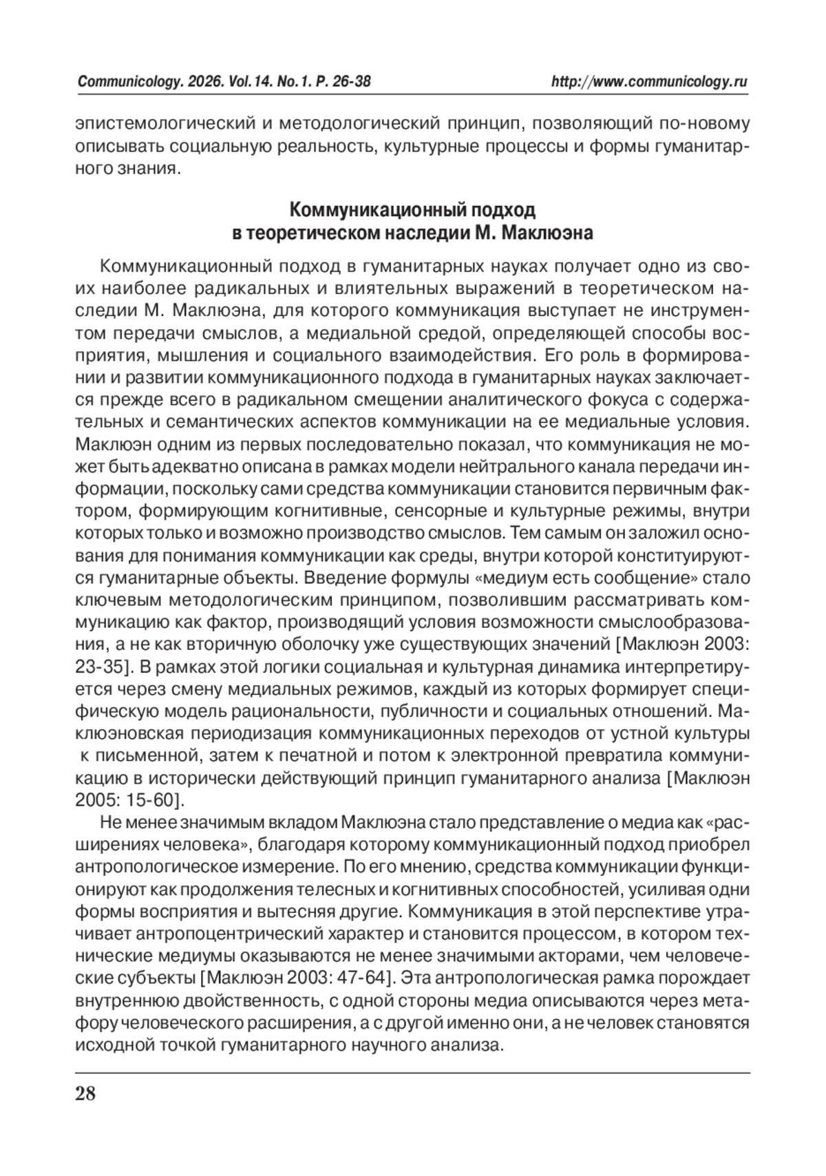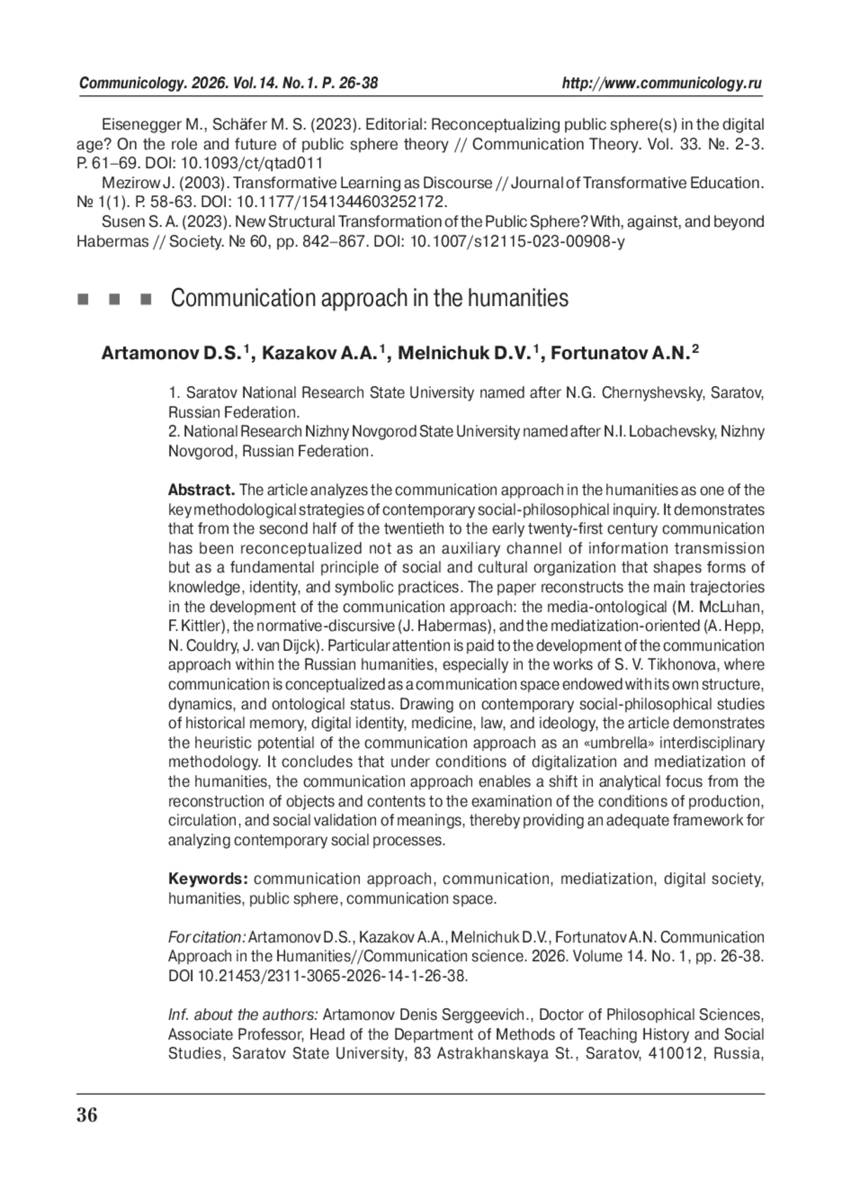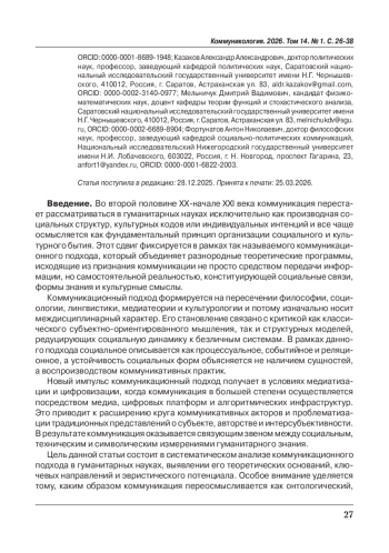 Статья посвящена анализу коммуникационного подхода в гуманитарных науках как одной из ключевых методологических стратегий современного социально-философского знания. Показано, что во второй половине ХХ – начале XXI века коммуникация переосмысливается не как вспомогательный канал передачи информации, а как фундаментальный принцип организации социального и культурного бытия, определяющий формы знания, идентичности и символических практик. В работе реконструируются основные линии развития коммуникационного подхода: медиальноонтологическая (М. Маклюэн, Ф. Киттлер), нормативно-дискурсивная (Ю. Хабермас) и медиатизационная (А. Хепп, Н. Коклдри, Ж. ван Дейк). Особое внимание уделяется развитию коммуникационного подхода в российской гуманитарной традиции, прежде всего в работах С. В. Тихоновой, где коммуникация концептуализируется как коммуникационное пространство, обладающее собственной структурой, динамикой и онтологическим статусом. На материале современных социально-философских исследований исторической памяти, цифровой идентичности, медицины, права и идеологии демонстрируется эвристический потенциал коммуникационного подхода как «зонтичной» междисциплинарной методологии. Делается вывод о том, что в условиях цифровизации и медиатизации гуманитарного знания коммуникационный подход позволяет сместить аналитический фокус с реконструкции объектов и содержаний к исследованию условий производства, циркуляции и социальной валидизации смыслов, выступая адекватной рамкой анализа современных социальных процессов.