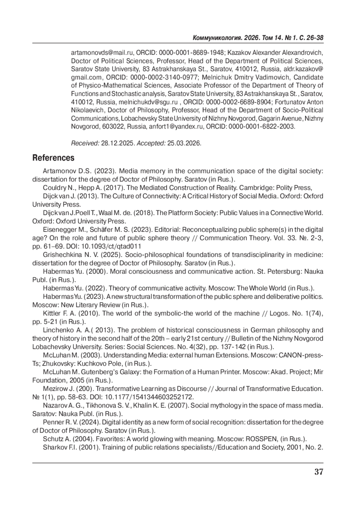 25. Eisenegger M., Schäfer M. S. (2023). Editorial: Reconceptualizing public sphere(s) in the digital age? On the role and future of public sphere theory // Communication Theory. Vol. 33. №. 2-3. Р. 61-69. https://doi.org/10.1093/ct/qtad011