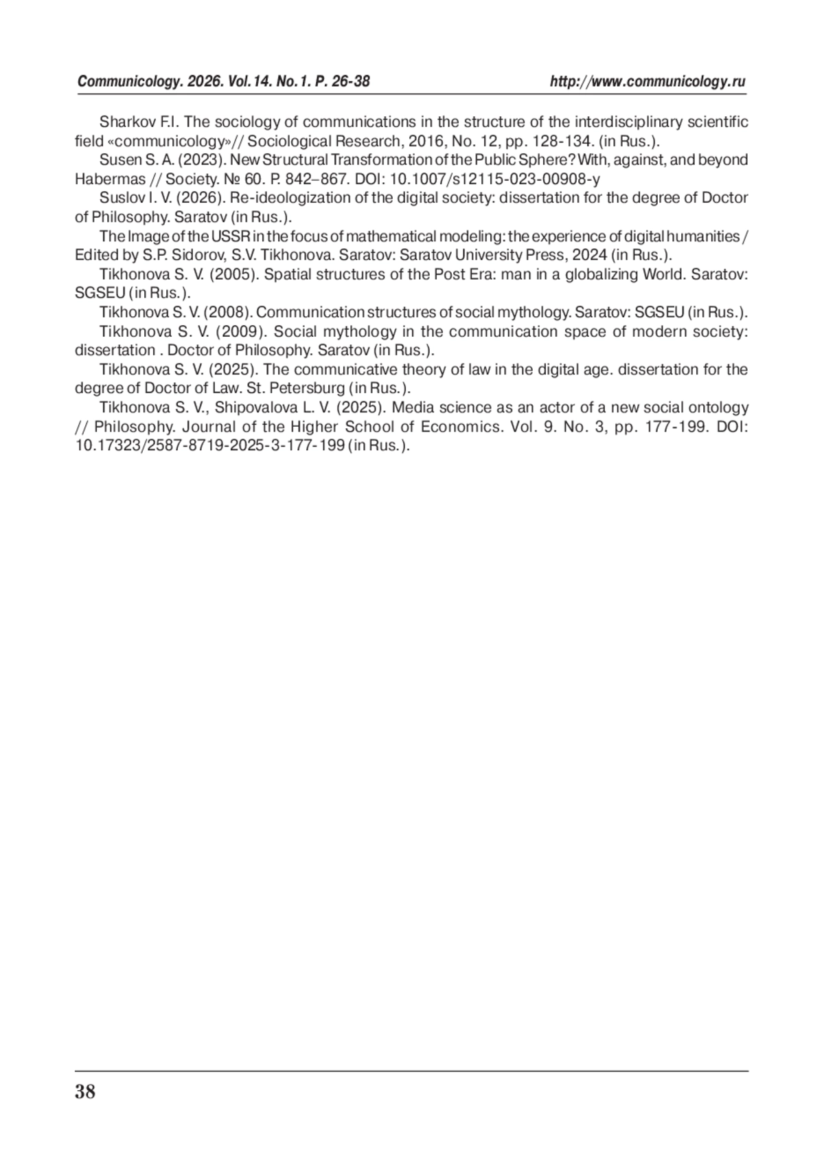 10. Суслов И. В. (2026). Реидеологизация цифрового общества: диссертация на соискание ученой степени доктора философских наук. Саратов.