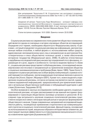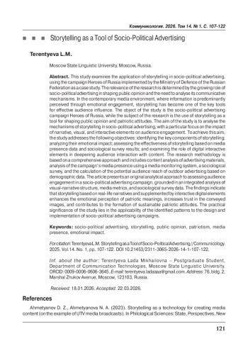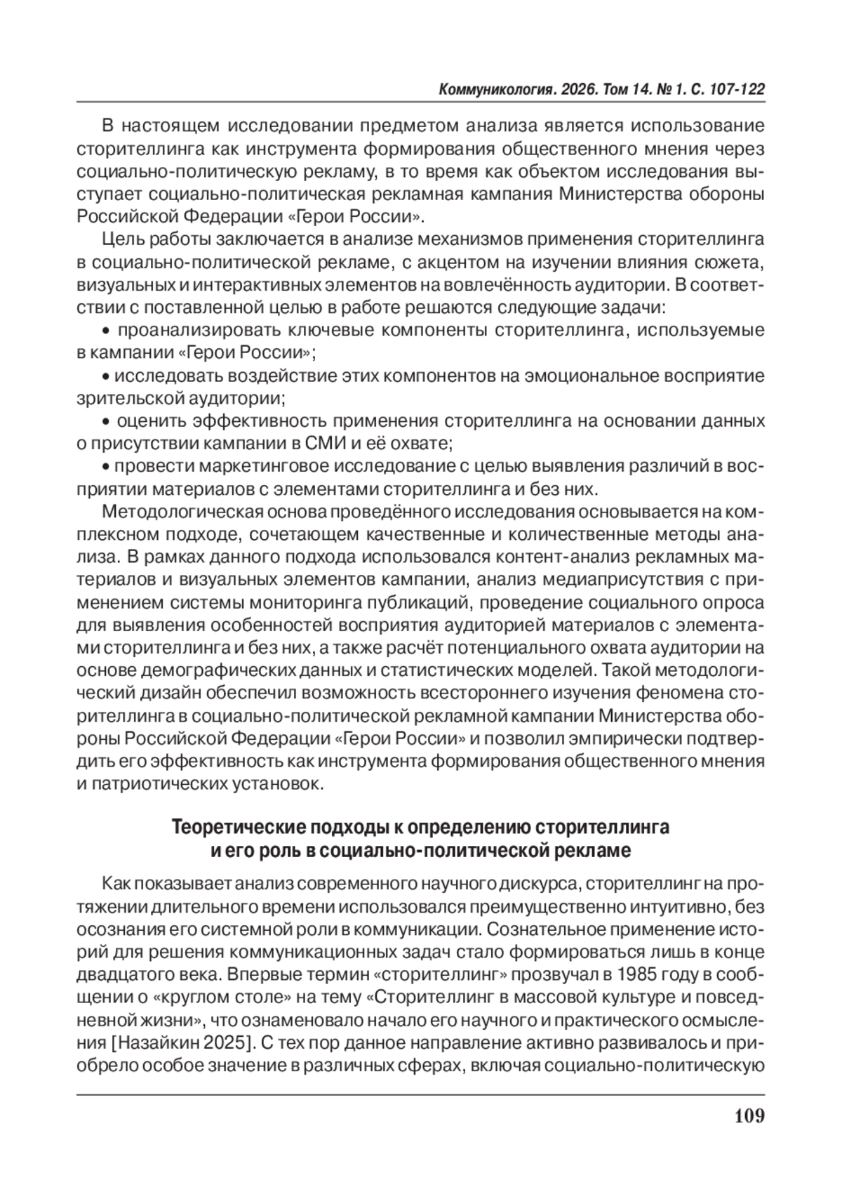 Исследование посвящено анализу применения сторителлинга в социально-политической рекламе на примере кампании Министерства обороны Российской Федерации «Герои России». Актуальность работы обусловлена возрастающей ролью социально-политической рекламы в формировании общественного мнения и необходимостью изучения её коммуникативных механизмов. В современной медиасреде, где восприятие информации преимущественно эмоционально, сторителлинг становится одним из ключевых инструментов эффективного воздействия на аудиторию. Объектом исследования является социально-политическая рекламная кампания «Герои России», предметом исследования – использование сторителлинга как инструмента формирования общественного мнения и патриотических установок. Цель работы заключается в анализе механизмов применения сторителлинга в социально-политической рекламе с акцентом на влияние нарративных, визуальных и интерактивных элементов на вовлечённость аудитории. Для достижения поставленной цели в статье решаются следующие задачи: выявление ключевых компонентов сторителлинга, анализ их эмоционального воздействия, оценка эффективности сторителлинга на основе данных медиаприсутствия и социологического опроса, а также анализ роли цифровых интерактивных элементов в углублении взаимодействия аудитории с контентом. Методология исследования основана на комплексном подходе и включает контентанализ рекламных материалов, анализ информационного присутствия кампании в средствах массовой информации с использованием системы мониторинга, социологический опрос, а также расчёт потенциального охвата аудитории наружной рекламой на основе демографических данных. В статье представлен авторский аналитический подход к оценке вовлечённости аудитории в социально-политической рекламной кампании, основанный на комплексном анализе визуально-нарративной структуры, показателей медиаприсутствия и данных социологического опроса. Полученные результаты свидетельствуют о том, что сторителлинг, основанный на реальных историях и дополненный интерактивными цифровыми элементами, способствует усилению эмоционального восприятия патриотических смыслов, повышению доверия к транслируемым образам и формированию устойчивых патриотических установок. Практическая значимость исследования заключается в возможности использования выявленных закономерностей при разработке и реализации социально-политических рекламных кампаний.