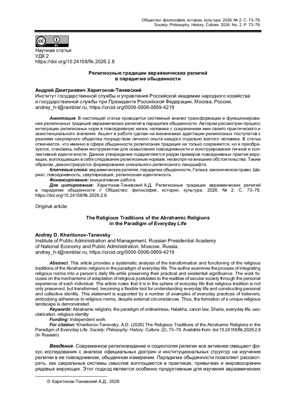 9. Kharchenko R. Principles of religious functioning in contemporary social practices // The Journal of V. N. Karazin Kharkiv National University. Series: Philosophy. Philosophical Peripeteias. 2025. No. 72. P. 310-319. DOI: 10.26565/2226-0994-2025-72-30