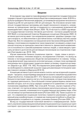 Существующий в прессе и общественном сознании образе пенсионера, казалось бы, исключает возможность вовлечения этой категории населения в число работающих налогоплательщиков. Противоречивое восприятие изучаемой социальной общности и попытки менять ее роль на государственном уровне не новы для развитых стран. Известно, что реализация концепции активного долголетия в Европе не дала результата, так как оказалась перегружена позитивными установками и не учитывала различий возраста пожилых [Галкин 2023: 94].