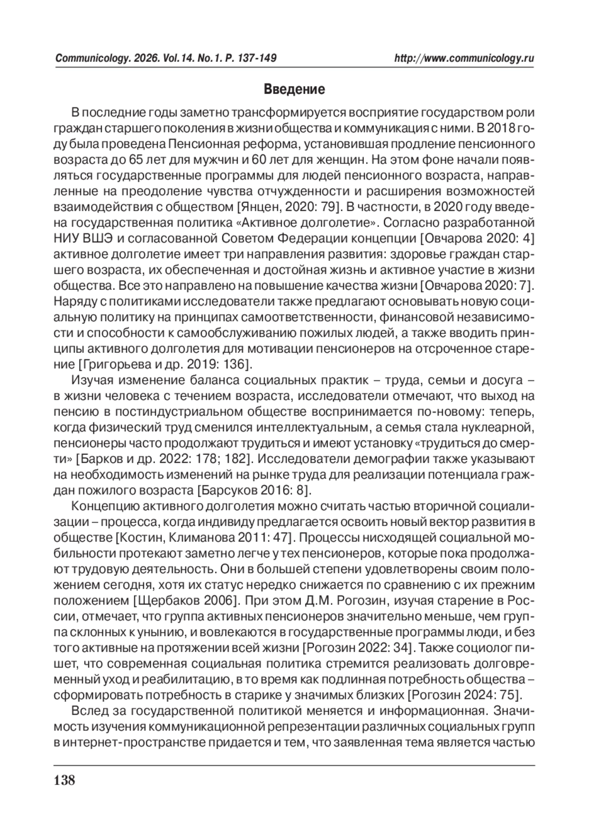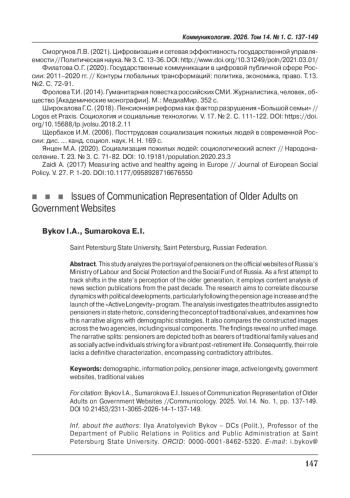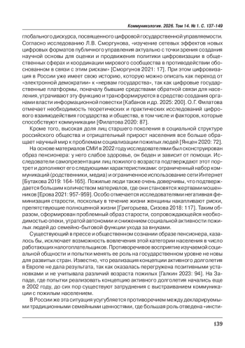 Предметом исследования является образ граждан пенсионного возраста, формируемый на сайтах Министерства труда и социальной защиты Российской Федерации и Социального фонда России. Научная новизна заключается в том, что это первая попытка оценить отраженные в коммуникациях изменения в восприятии государством роли старшего поколения в социально-экономической системе. Используя метод контент-анализа, автор статьи анализирует контент государственных информационных ресурсов с целью изучить динамику дискурса, посвященного старшему поколению, за последние 10 лет и определить его текущие характеристики. Автор анализирует трансформацию государственной риторики после повышения пенсионного возраста и принятия программы «Активное долголетие», а также с учетом концепции традиционных ценностей. Также автор обращает внимание на визуальную часть контента. Результаты исследования позволяют сделать вывод, что единого портрета пенсионера нет: в одной части новостной повестки люди старшего возраста представлены носителями традиционных семейных ценностей, а в другой – имеющими активную социальную деятельность, стремящиеся сохранить качество и насыщенность жизни после выхода на пенсию. Таким образом, роль пенсионеров не имеет однозначного определения и наделена противоречивыми, зачастую взаимоисключающими характеристиками.