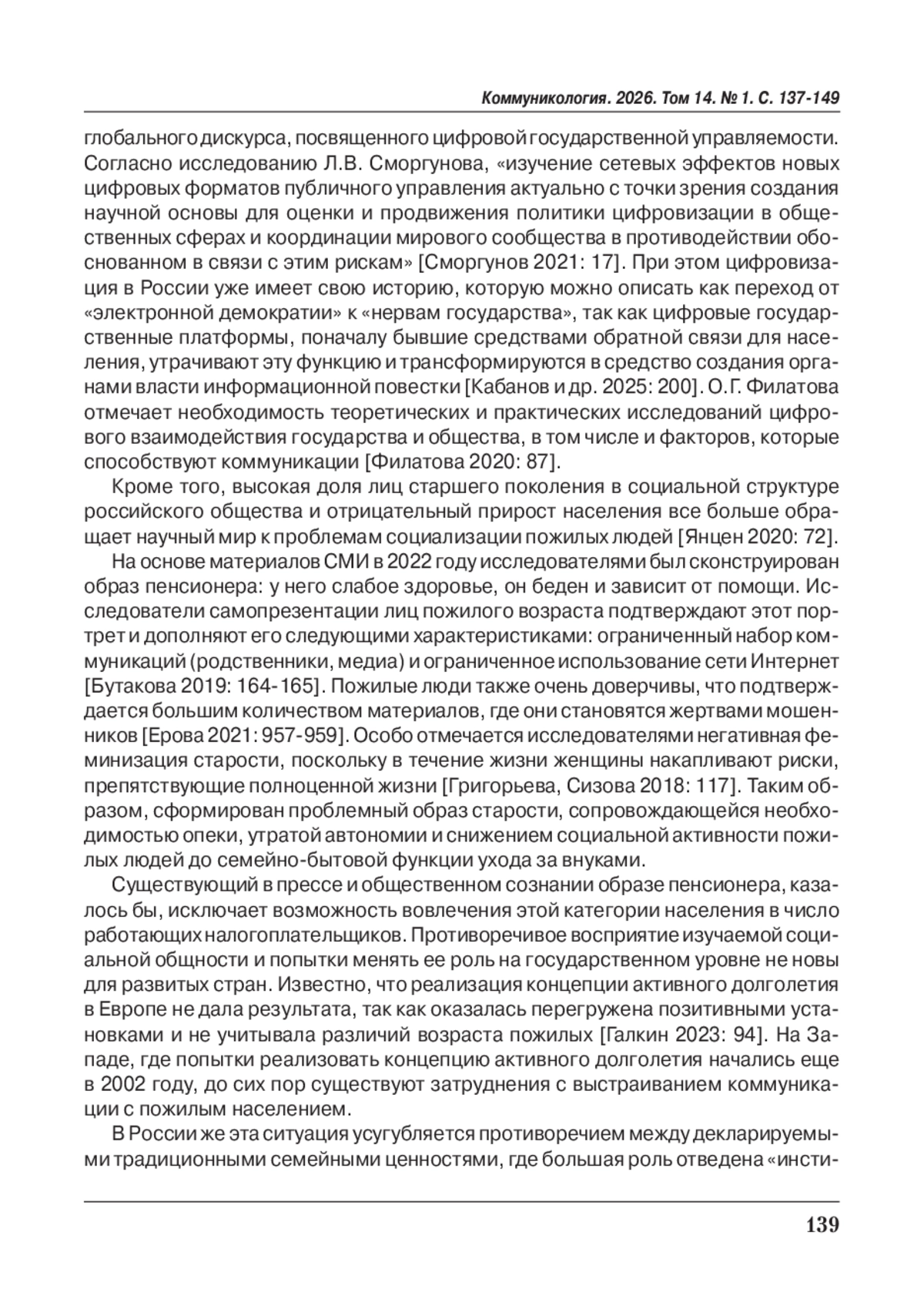 4. Бутакова Л.О. (2019). Самопрезентация пожилого возраcта в режиме социальнокоммуникативных и смысловых характеристик определенной возрастной группы // Этнопсихолингвистика. №2. С. 160-174. https://doi.org/10.31249/epl/2019.02.11