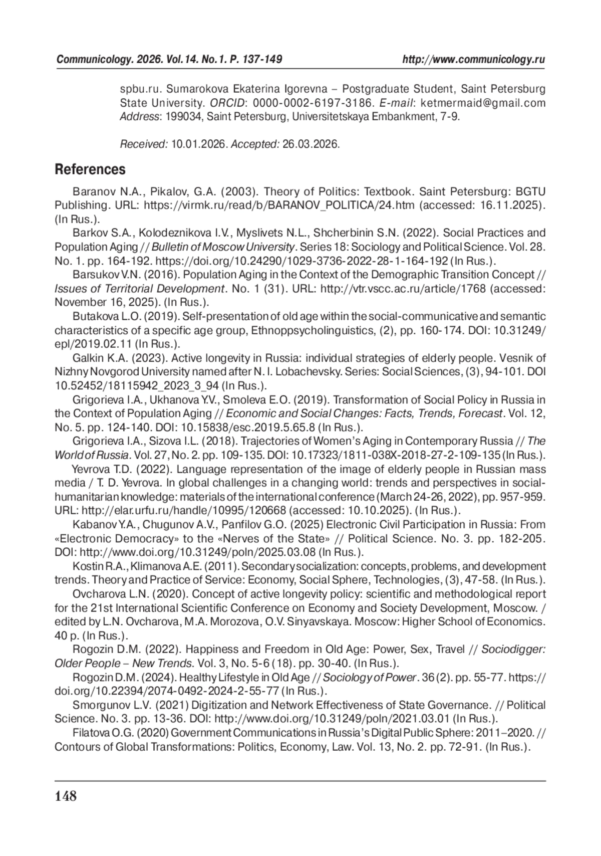 2. Барков С.А, Колодезникова И.В., Мысливец Н.Л., Щербинин С.Н. (2022). Социальные практики и старение населения // Вестник Московского университета. Серия 18: Социология и политология. Том 28. № 1. С. 164-192. https://doi.org/10.24290/1029-3736-2022-28-1-164-192