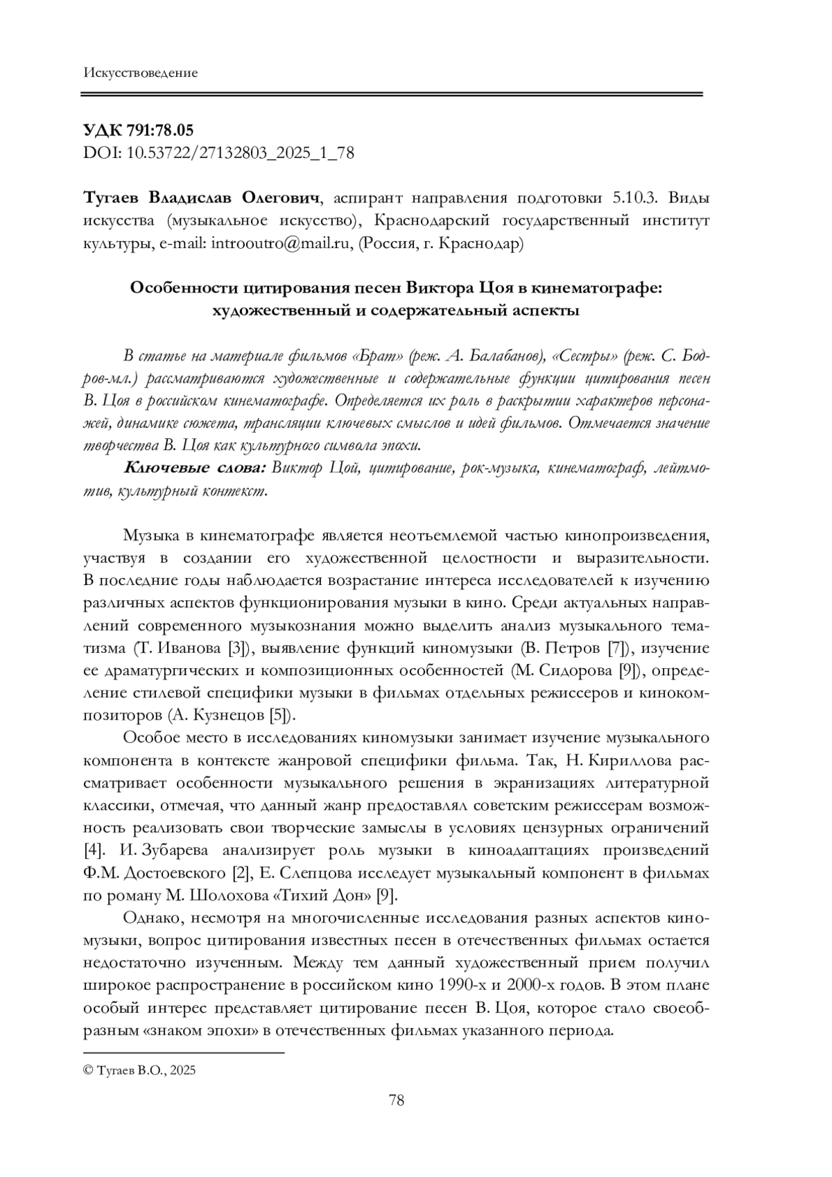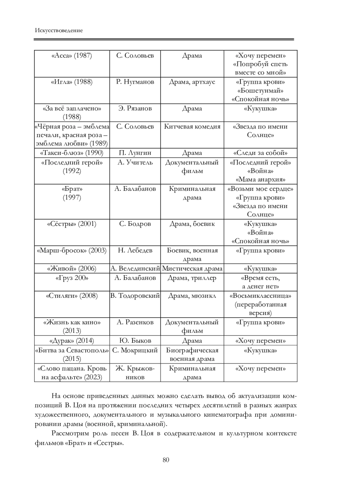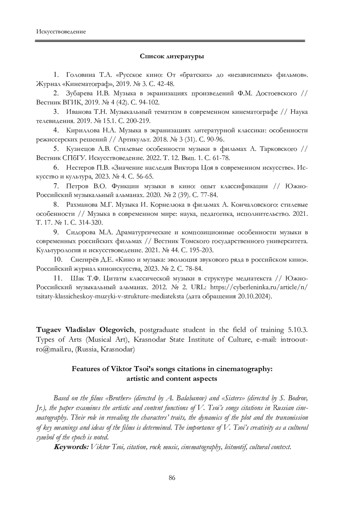 В статье на материале фильмов «Брат» (реж. А. Балабанов), «Сестры» (реж. С. Бодров-мл.) рассматриваются художественные и содержательные функции цитирования песен В. Цоя в российском кинематографе. Определяется их роль в раскрытии характеров персонажей, динамике сюжета, трансляции ключевых смыслов и идей фильмов. Отмечается значение творчества В. Цоя как культурного символа эпохи.