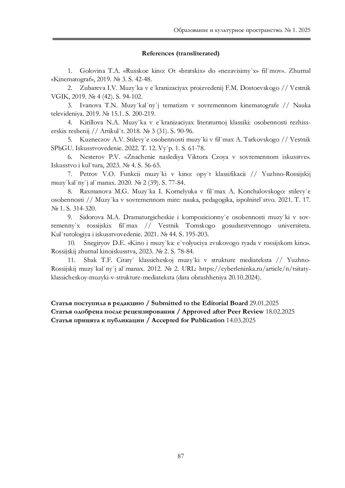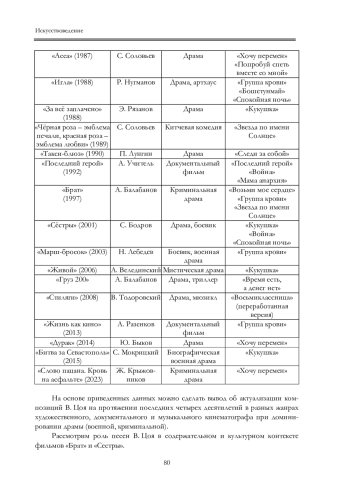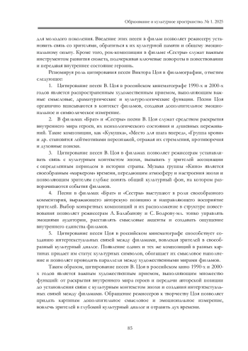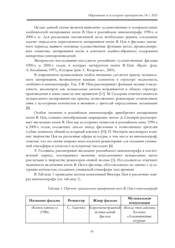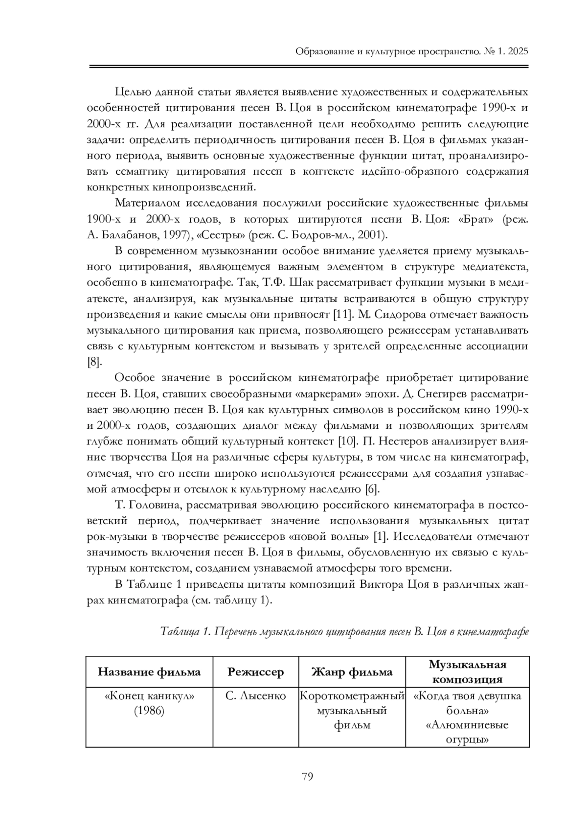 В статье на материале фильмов «Брат» (реж. А. Балабанов), «Сестры» (реж. С. Бодров-мл.) рассматриваются художественные и содержательные функции цитирования песен В. Цоя в российском кинематографе. Определяется их роль в раскрытии характеров персонажей, динамике сюжета, трансляции ключевых смыслов и идей фильмов. Отмечается значение творчества В. Цоя как культурного символа эпохи.