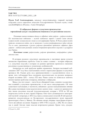 В истории русского сундучного производства в настоящее время остается множество нерешенных проблем. Одна из самых сложных – история гибридов, т. е. сундучных изделий, в которых по разным причинам произошло смешение различных художественных и технических особенностей.