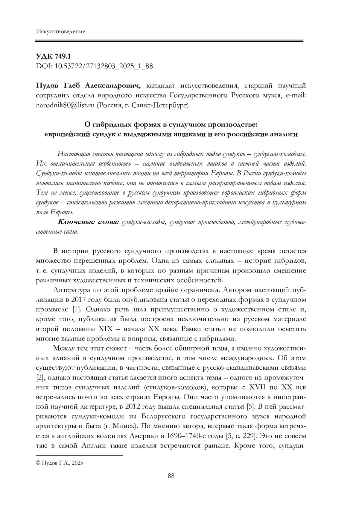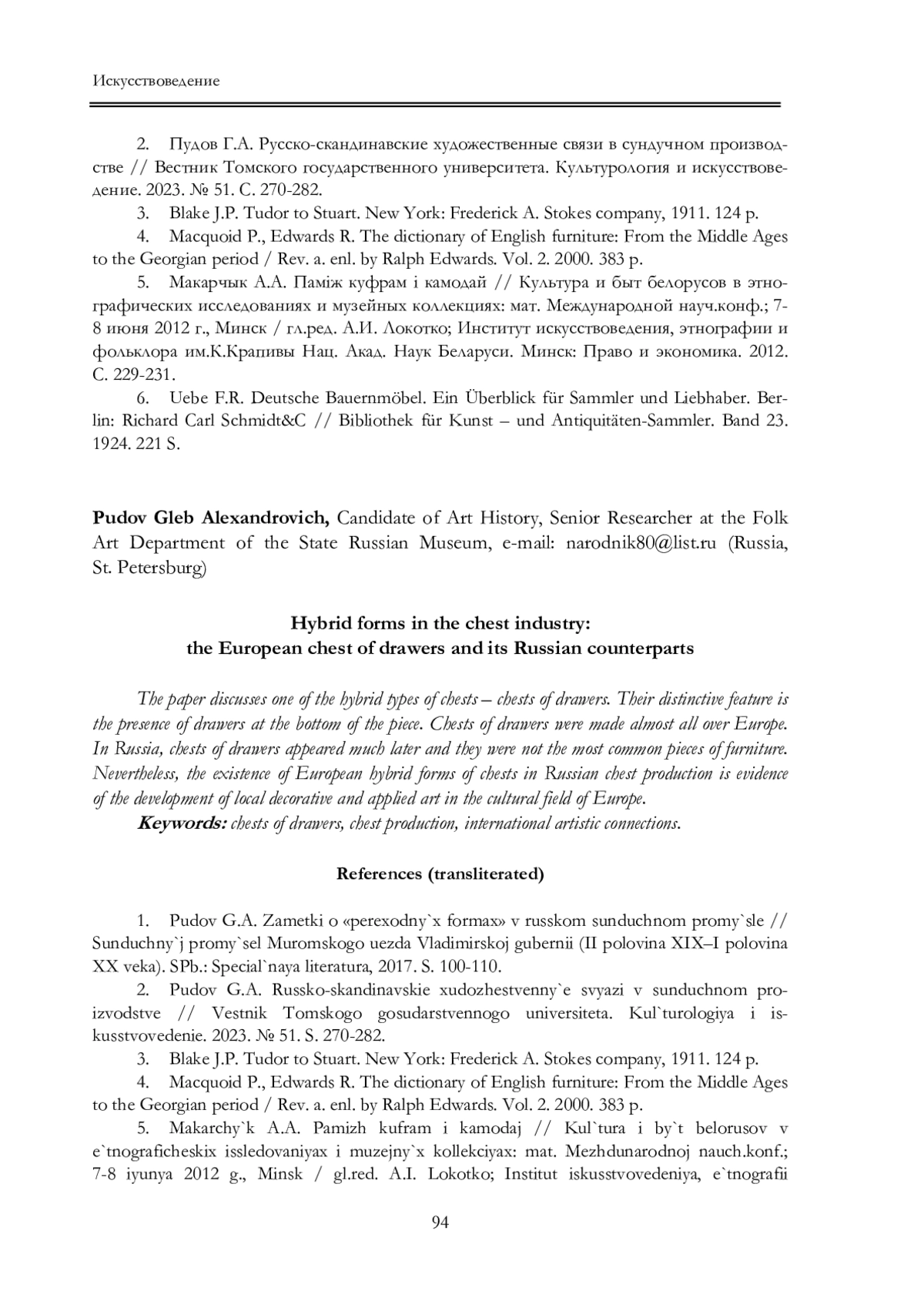 1. Пудов Г.А. Заметки о “переходных формах” в русском сундучном промысле // Сундучный промысел Муромского уезда Владимирской губернии (II половина XIX-I половина XX века). СПб.: Специальная литература, 2017. С. 100-110. Искусствоведение.
