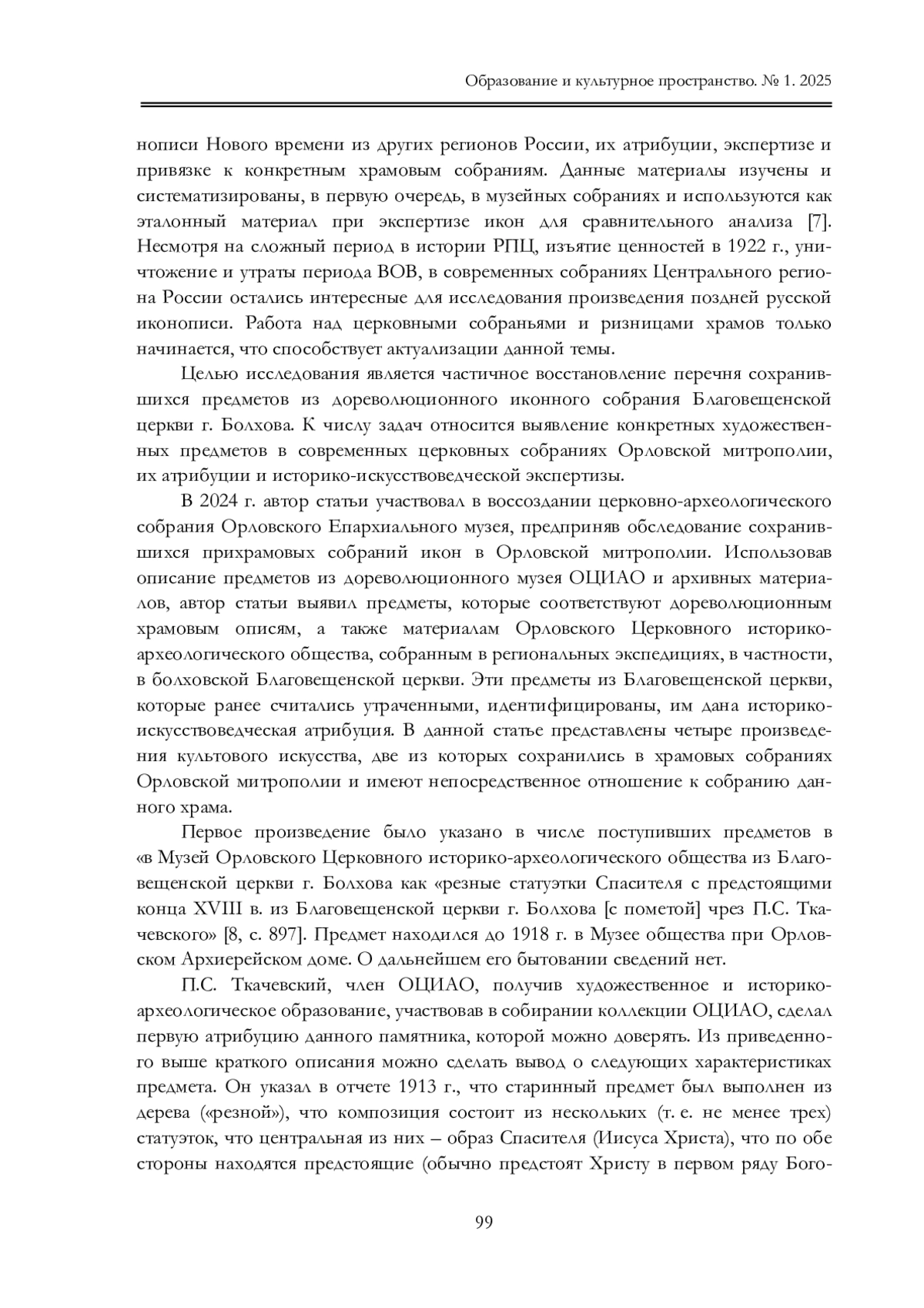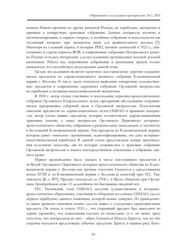 5. Лазарева Т.В. Убранство Михаило-Архангельской церкви села Каменское (Сабурово) по описаниям 1808 года // Образование и культурное пространство. 2021. № 3. С. 44-52. EDN: SWSDEM