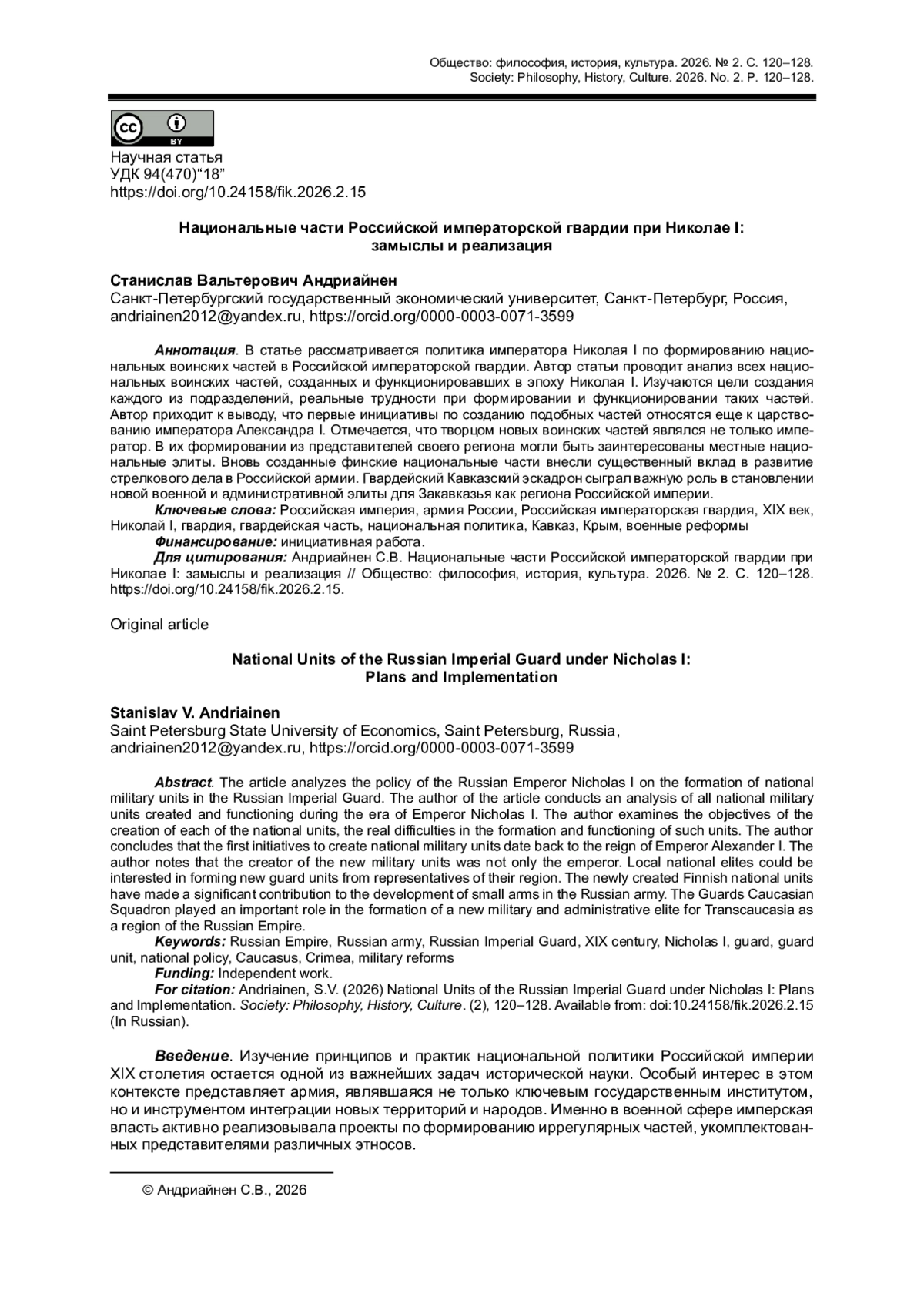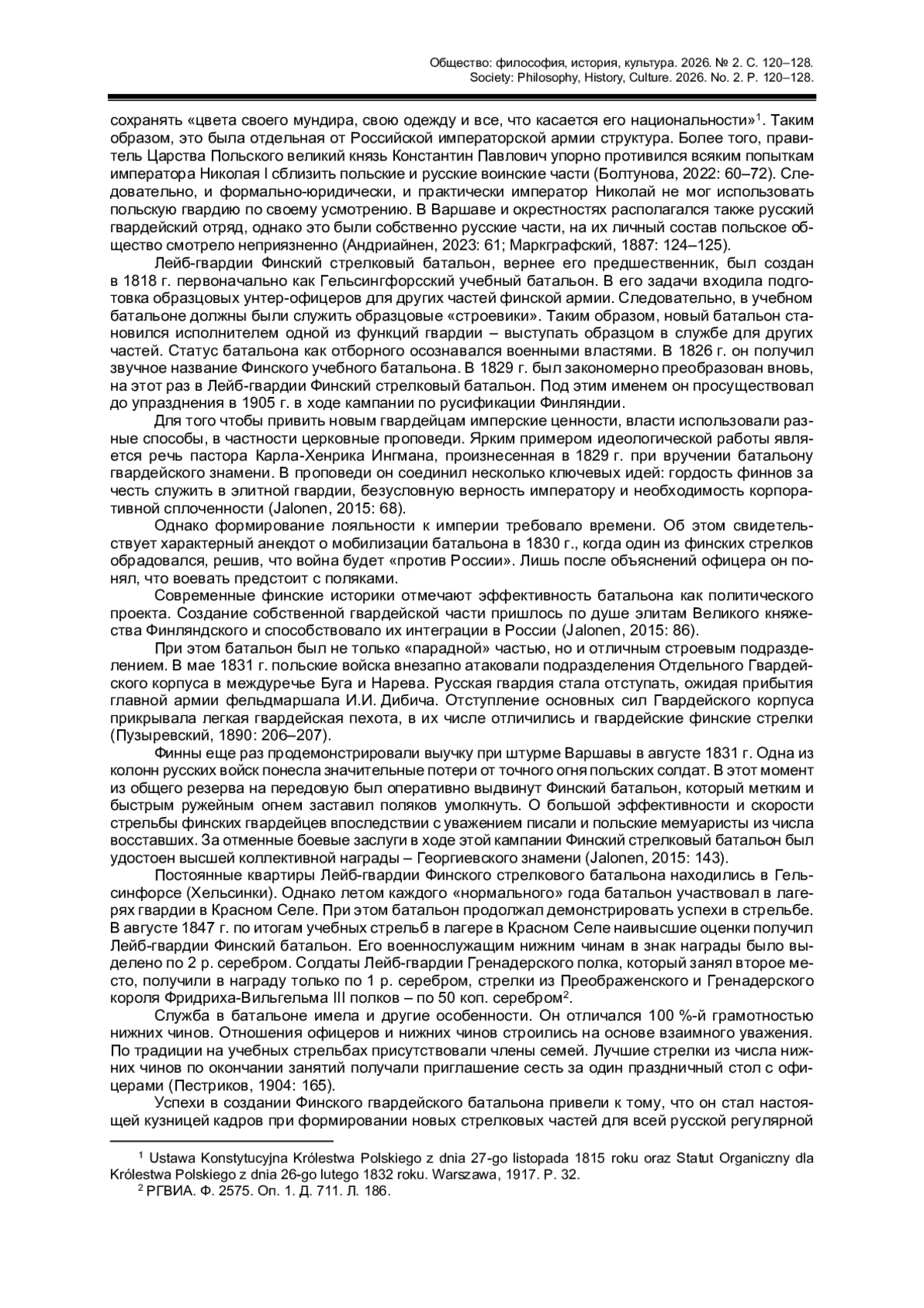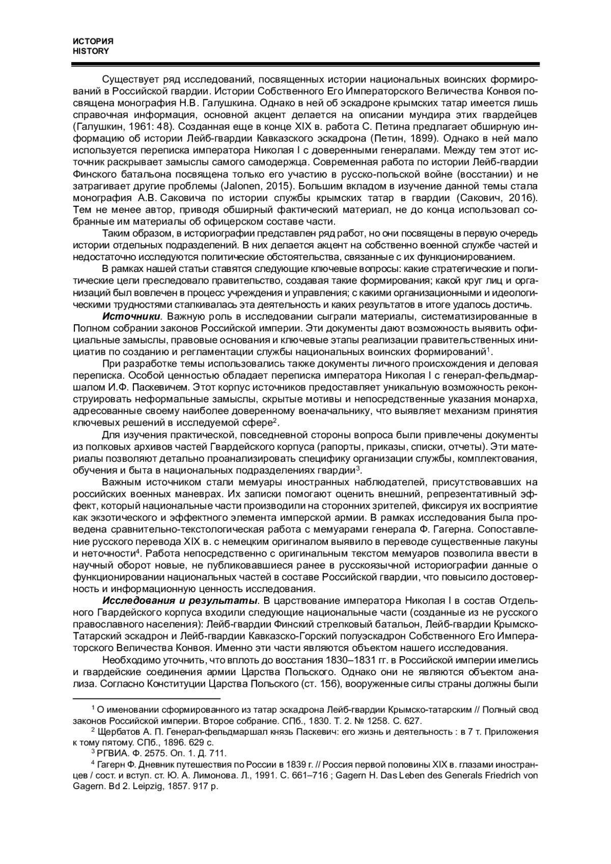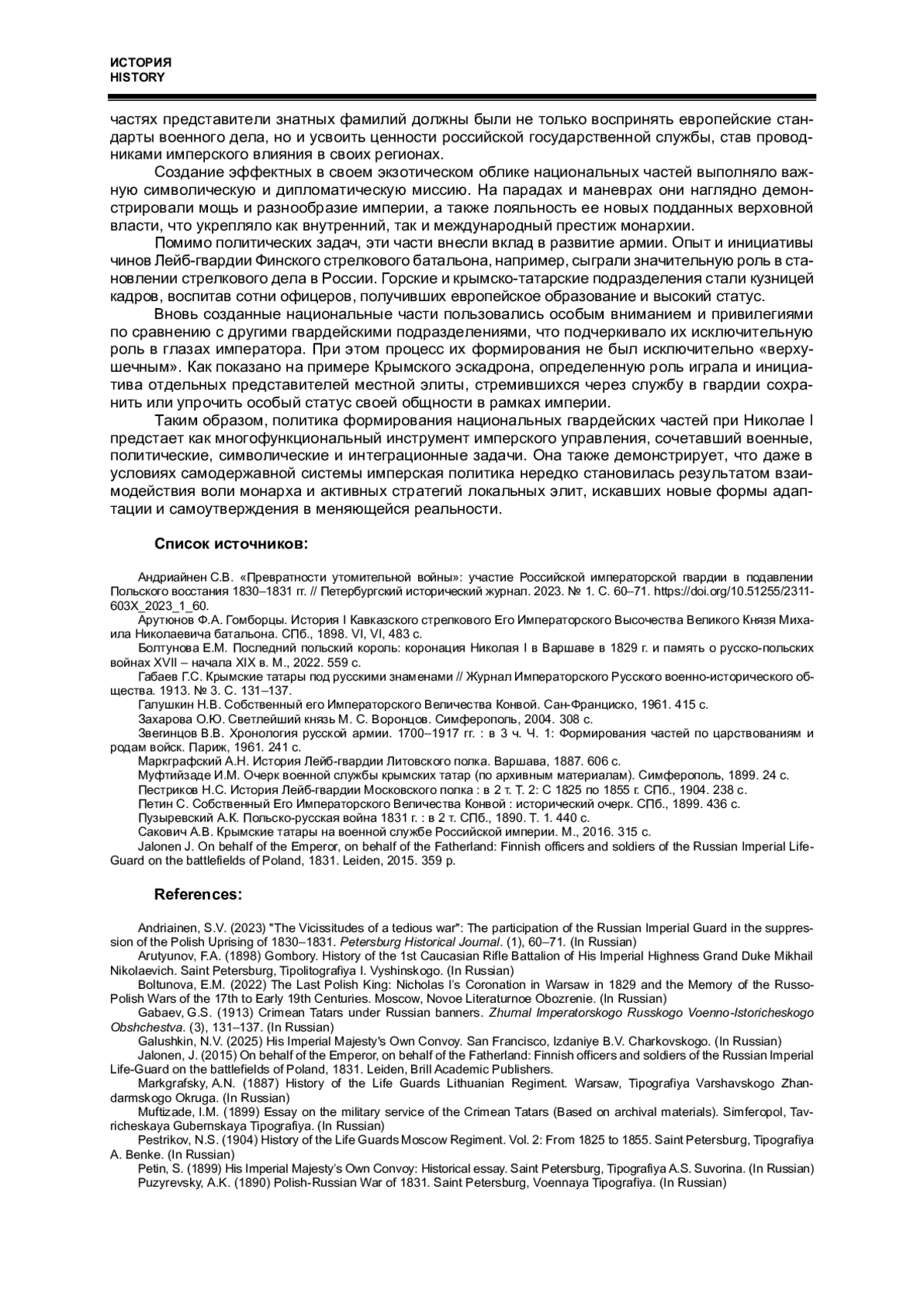 1. Андриайнен С.В. “Превратности утомительной войны”: участие Российской императорской гвардии в подавлении Польского восстания 1830-1831 гг. // Петербургский исторический журнал. 2023. № 1. С. 60-71. DOI: 10.51255/2311-603X_2023_1_60 EDN: MAOGUF