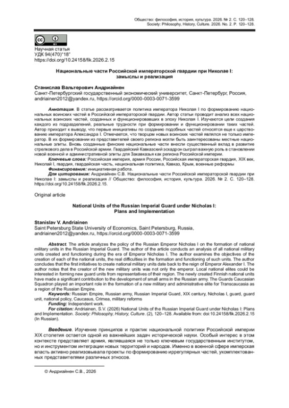 В статье рассматривается политика императора Николая I по формированию национальных воинских частей в Российской императорской гвардии. Автор статьи проводит анализ всех национальных воинских частей, созданных и функционировавших в эпоху Николая I. Изучаются цели создания каждого из подразделений, реальные трудности при формировании и функционировании таких частей.