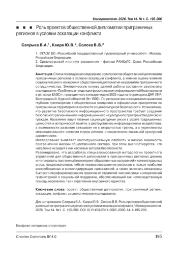 Статья посвящена исследованию роли проектов общественной дипломатии приграничных регионов в условии эскалации конфликта, а именно оценке влияния социокультурного измерения общественной дипломатии на развитие приграничного сотрудничества. Эмпирическую основу данной работы составили результаты исследования «Проблемы и тенденции формирования информационной безопасности в регионах ЕАЭС»», проведенного в январе-марте 2025 года на территориях ДНР, ЛНР, Белгородской, Курской областей (N=1500). По результатам исследования выявлено глубокое противоречие в общественных ожиданиях и официальных приоритетах на приграничных территориях в контексте социокультурной безопасности. Установлено, что развитие безопасного информационного пространства требует создания безопасного регионального информационного и культурного пространства для своих граждан. Население видит главные социокультурные риски в утрате традиционных ценностей и исторической памяти, в деструктивном информационном воздействии, а возможности развития связывает не с открытостью границ, а с укреплением межнационального согласия внутри региона и сохранением локальной культурной идентичности. Исследование выявляет институциональную слабость и низкую видимость приграничной миссии общественного сектора, при этом диагностируется, что население не видит в них ключевых акторов безопасности. Резюмировано, что разработка специализированной методологии проектного управления для общественной дипломатии в приграничных регионах должна интегрировать постоянный мониторинг общественных настроений и контекстуальных угроз, предусматривать гибкое перераспределение ресурсов в пользу наиболее востребованных и консолидирующих направлений, а также включать механизмы быстрого переформатирования проектов от стратегий «мягкой силы» к оперативной гуманитарной и социальной поддержке, обеспечивающей как непосредственную помощь населению, так и укрепление внутреннего единства.
