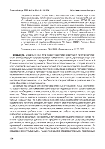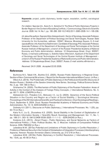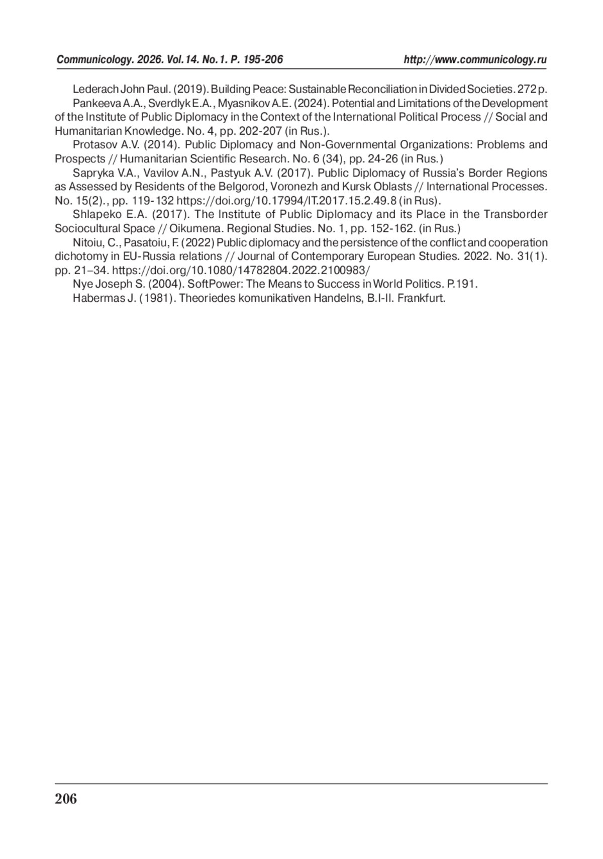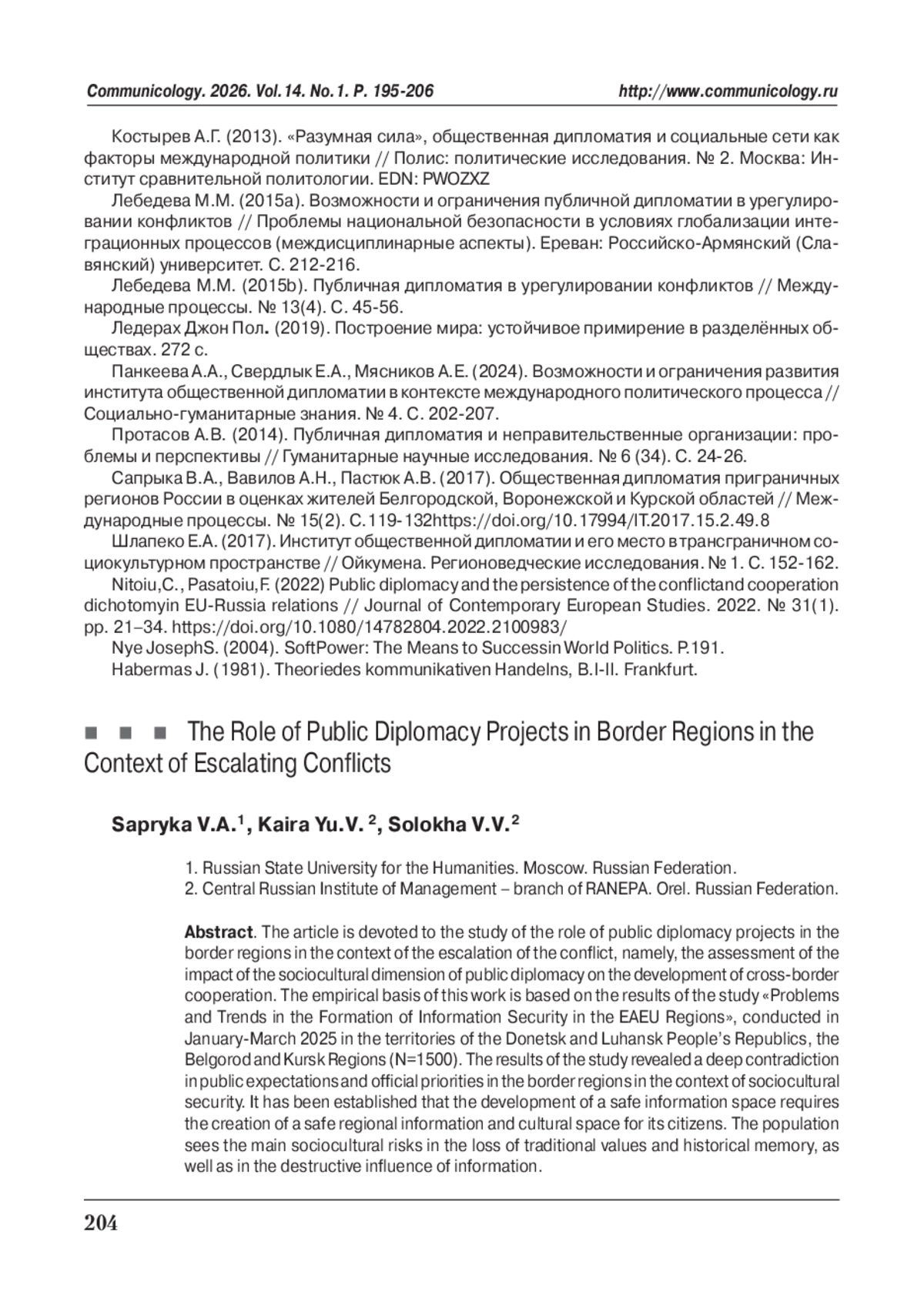 13. Сапрыка В.А., Вавилов А.Н., Пастюк А.В. (2017). Общественная дипломатия приграничных регионов России в оценках жителей Белгородской, Воронежской и Курской областей // Международные процессы. № 15(2). https://doi.org/https://doi.org/10.17994/IT.2017.15.2.49.8